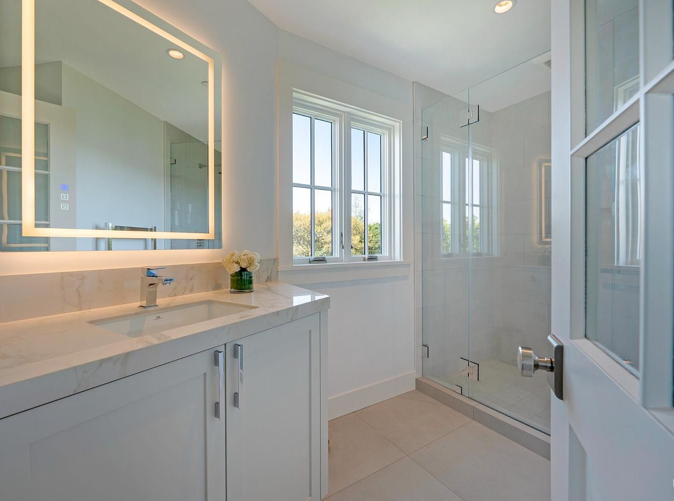This bathroom features a clean, modern design with a light and airy atmosphere. A sleek white vanity with a polished marble countertop anchors the space, accompanied by a rectangular undermount sink and a contemporary chrome faucet. Above the vanity, a large square mirror is framed with integrated LED backlighting, adding a warm, inviting glow. Natural light streams in through a double-hung window with white trim, brightening the room. To the right, a frameless glass shower enclosure with minimalist hardware enhances the openness, while neutral beige floor tiles unify the space with subtle warmth and simplicity.
