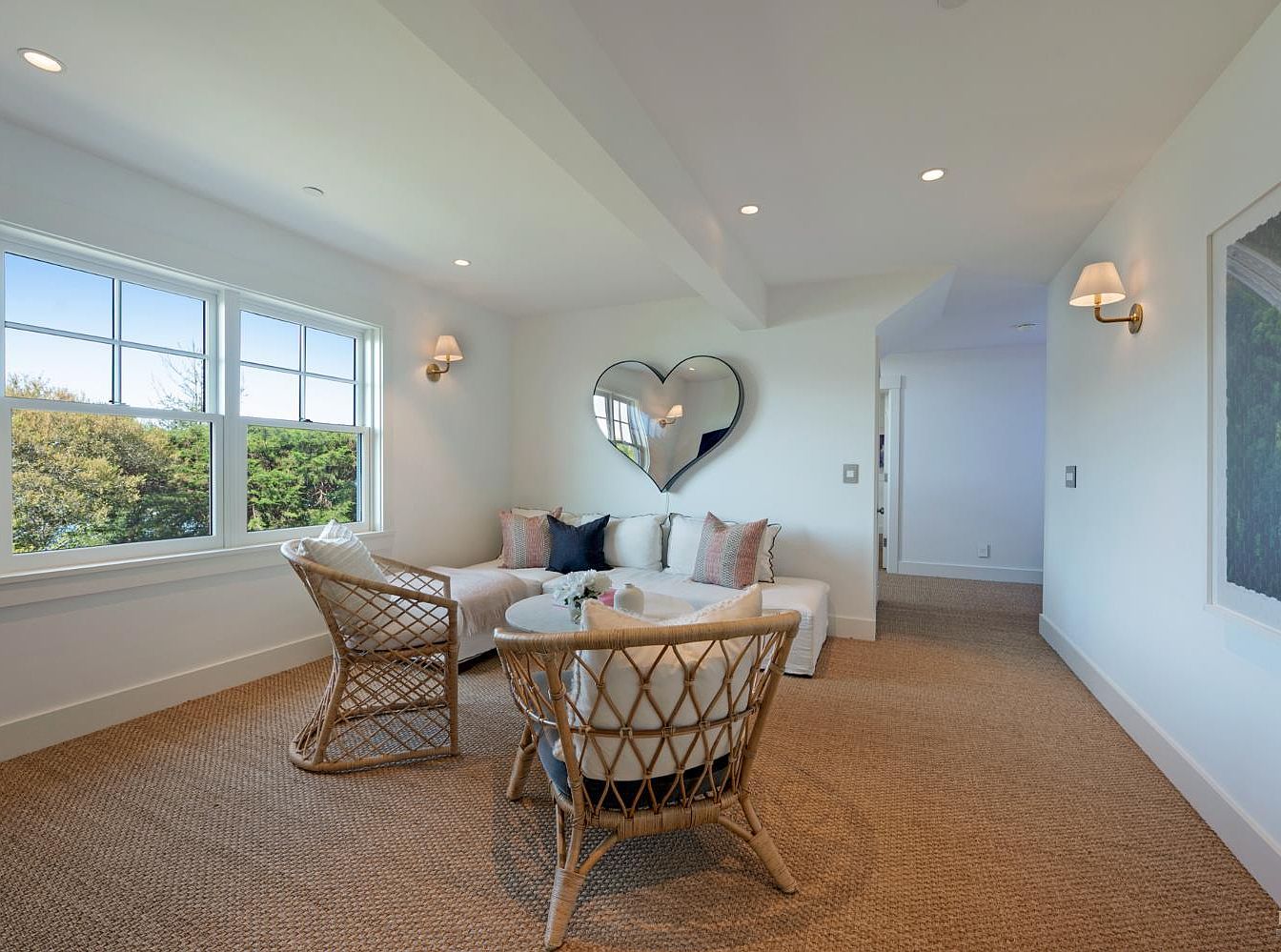 This cozy sitting nook features a neutral color palette dominated by soft whites and natural beige tones from the textured sisal carpet, creating an inviting and warm atmosphere. A white sectional sofa accented with muted pink and navy cushions provides comfortable seating while maintaining a clean look. Two rattan chairs with white cushions complement the natural fiber carpet, adding an organic texture. A heart-shaped mirror above the sofa serves as an eye-catching focal point, reflecting light and enhancing the airy feel. Brass wall sconces with white shades flank the space, lending subtle warmth. Large windows bring in abundant natural light and frame a view of lush greenery outside.