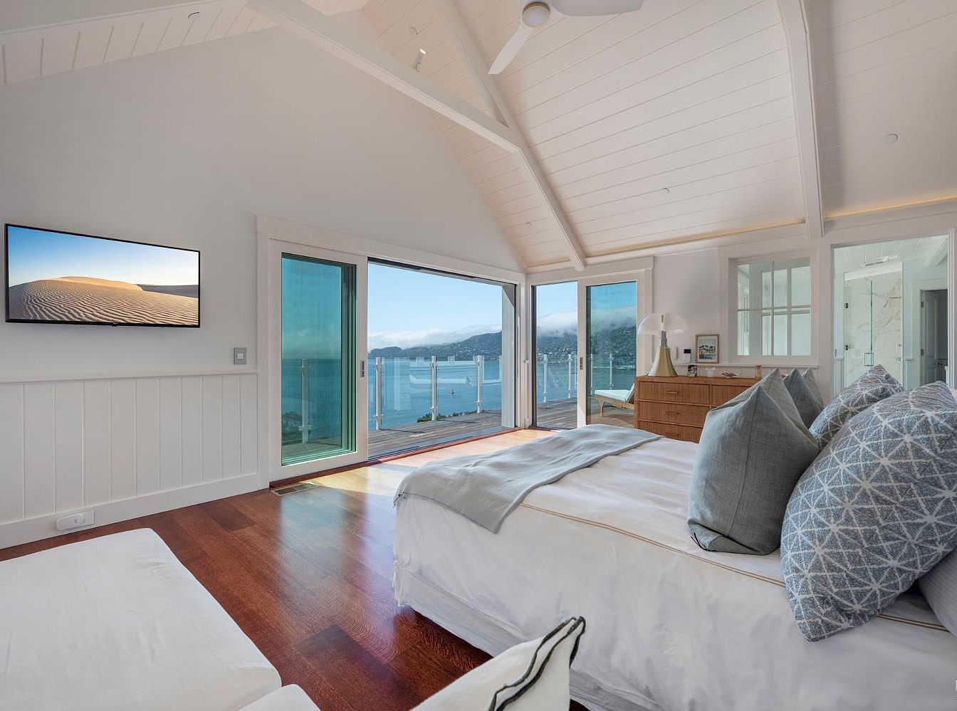 This serene master bedroom showcases a vaulted, white paneled ceiling with exposed beams, enhancing its airy and spacious feel. Rich hardwood floors add warmth and contrast beautifully with the crisp white walls and ceiling. The bed is adorned with a simple white comforter and an assortment of soft blue and patterned pillows, creating a calm and inviting atmosphere. Floor-to-ceiling sliding glass doors open to a balcony with glass railings, offering breathtaking panoramic views of the ocean and distant hills, bringing natural light and an outdoor connection to this tranquil retreat.
