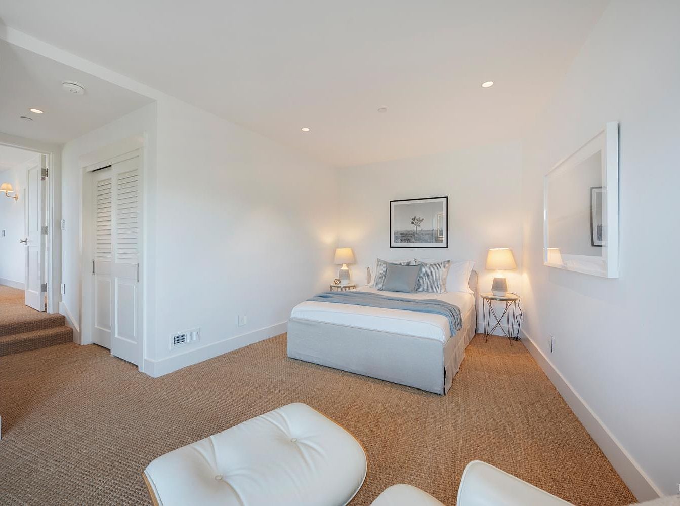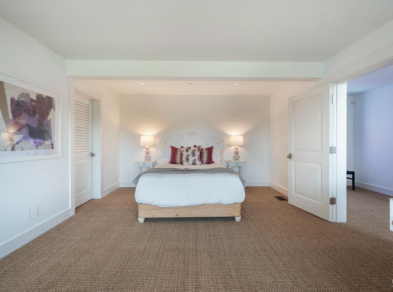This airy bedroom corner features a serene, neutral palette with white walls and warm beige woven carpeting. A queen-sized bed is neatly dressed in white linens accented with grey and blue pillows and a matching throw. Flanking the bed are two minimalist side tables holding modern lamps that emit a soft, inviting glow. The space is enhanced by simple yet elegant framed artwork above the bed and a large mirror on the adjacent wall, amplifying light and space. The room’s layout flows gently into a hallway with white paneled doors, creating a clean and calming retreat.