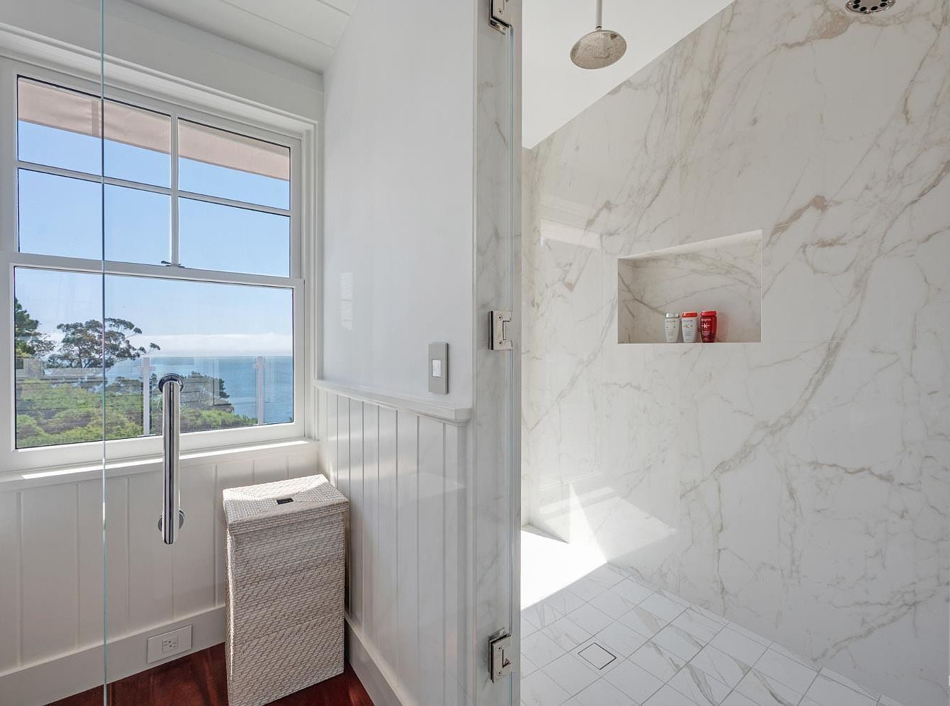 This bathroom features a modern, spacious shower with walls clad in sleek, white marble tiles accented by subtle gray veining that adds texture and sophistication. The shower floor is tiled with smaller square tiles, ensuring a cohesive look and safer footing. A built-in niche within the marble wall neatly holds shower essentials, emphasizing clean lines and practicality. Natural light floods the space through a large window, which offers a serene view of greenery and ocean beyond, injecting freshness and openness. White beadboard paneling below the window complements the soft, bright color palette, while a woven laundry basket adds a touch of natural warmth to the elegant ambiance.