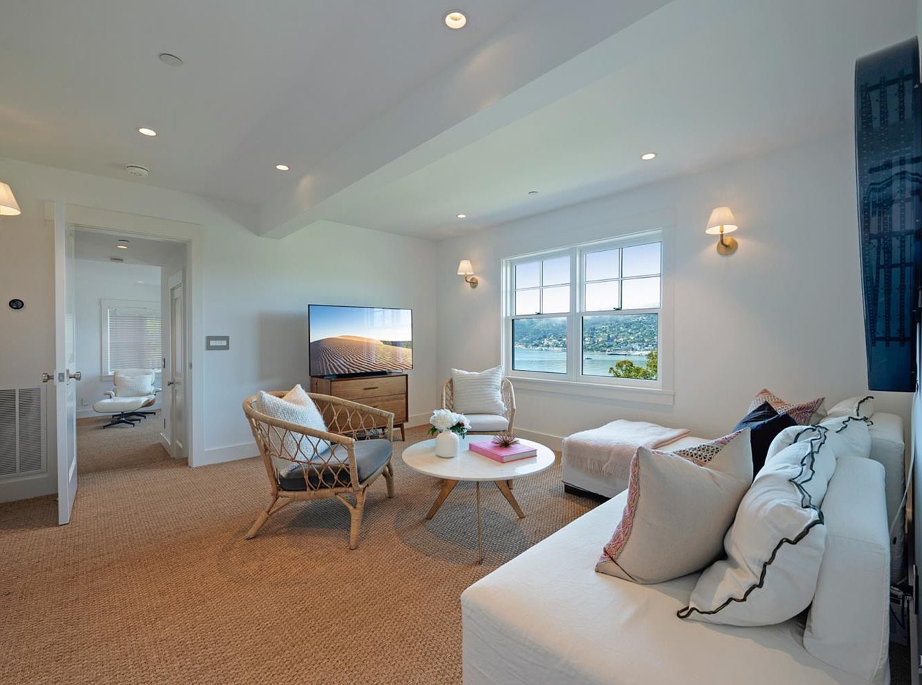 This comfortable living room features a neutral, earthy color palette dominated by warm beige carpeting and white walls, creating an inviting and tranquil atmosphere. The furniture includes a white sectional sofa adorned with multiple decorative pillows in soft tones, paired with two natural rattan armchairs with blue cushions. A round wooden coffee table with a white top sits centrally, decorated simply with a flower vase and books. The space benefits from abundant natural light streaming through large, divided-pane windows that offer impressive scenic views of a lake and hillside. Modern wall sconces and recessed ceiling lights add subtle, layered illumination. A flat-screen TV mounted on a wooden stand and clean architectural lines emphasize understated, relaxed elegance.