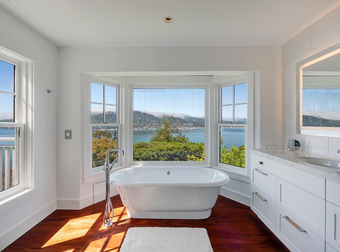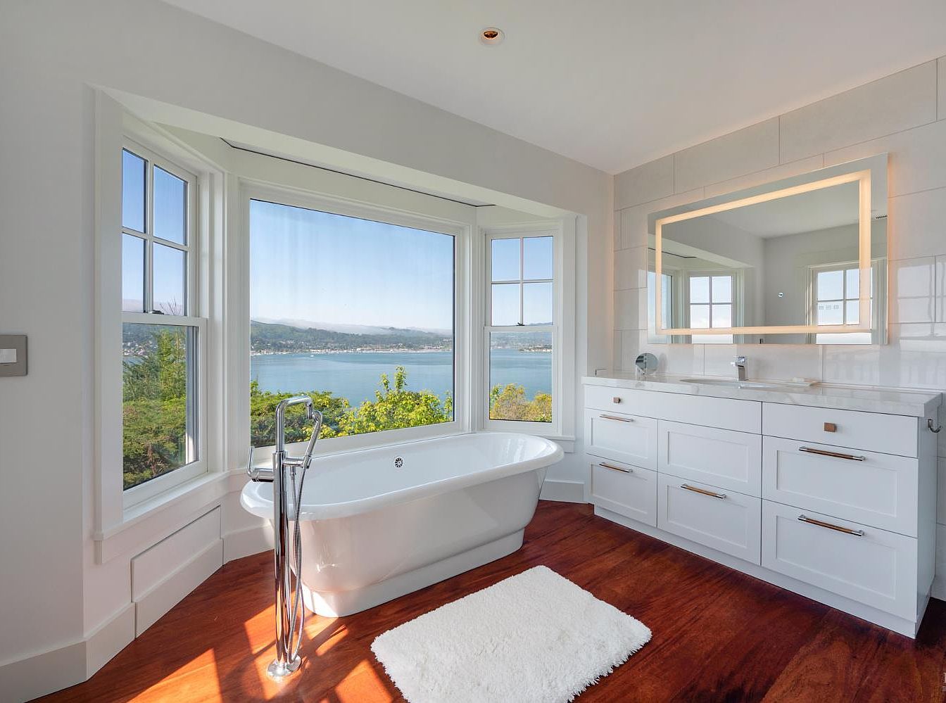 This elegant bathroom centers around a freestanding, modern white bathtub positioned in a charming bay window nook, offering stunning panoramic views of a serene body of water and distant hills. Natural light floods the room, highlighting the rich, warm tones of the polished hardwood floor. The surrounding white walls and cabinetry contribute to a fresh, airy ambiance, while sleek chrome fixtures add a touch of contemporary sophistication. A white bath rug adds softness underfoot, and a large, illuminated mirror above a marble countertop vanity enhances the space’s bright, clean aesthetic for a tranquil and luxurious bathing experience.