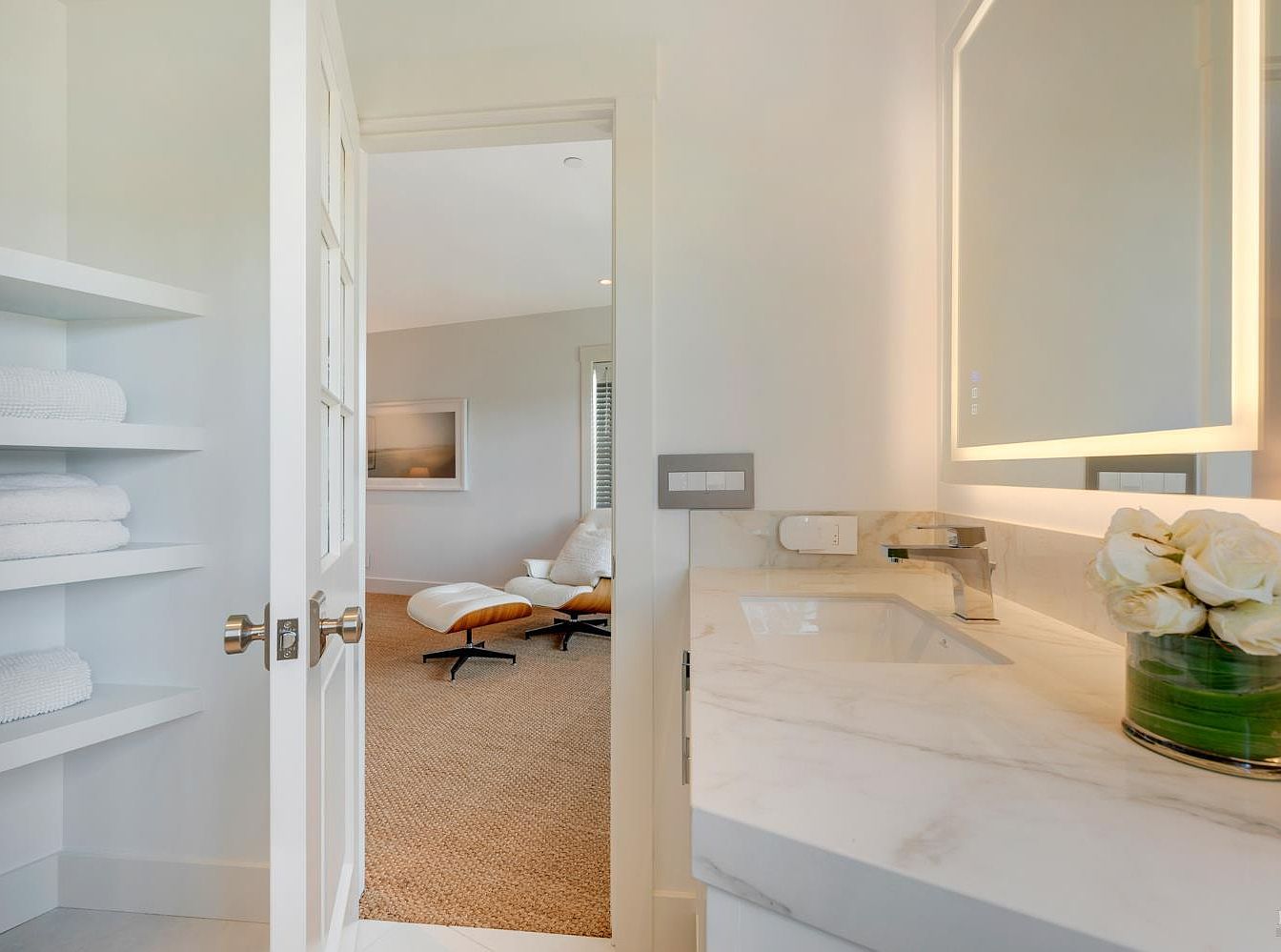 This bathroom corner features a sleek, modern vanity with a white marble countertop and an integrated sink. Above it, an illuminated rectangular mirror with soft LED backlighting adds an elegant touch, balancing functionality and subtle ambiance. A glass vase with fresh white roses introduces a delicate natural accent. Adjacent to the vanity is an open door leading into a carpeted room furnished with a stylish lounge chair and ottoman, enhancing the sense of flow and connection between spaces. Shelves stocked with neatly folded white towels extend the room’s clean, minimalist aesthetic.