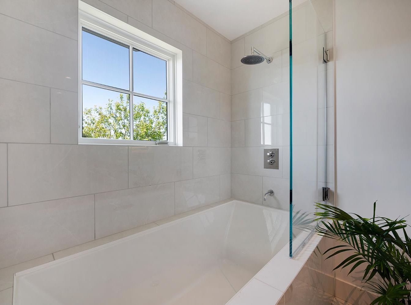 This bathroom features a clean, minimalist bathtub space with large rectangular light beige tiles adorning the walls, offering a soft neutral palette that enhances natural lighting. A sizable window above the tub invites abundant daylight and frames a view of lush green foliage outside, creating a calming ambiance. The built-in bathtub has sharp, clean lines complemented by modern chrome fixtures, including a rainfall showerhead mounted on the wall and a separate spout for filling the tub. A clear glass partition separates the shower area, maintaining an open feel. A green leafy plant adds a touch of nature to this tranquil and contemporary bathing space.