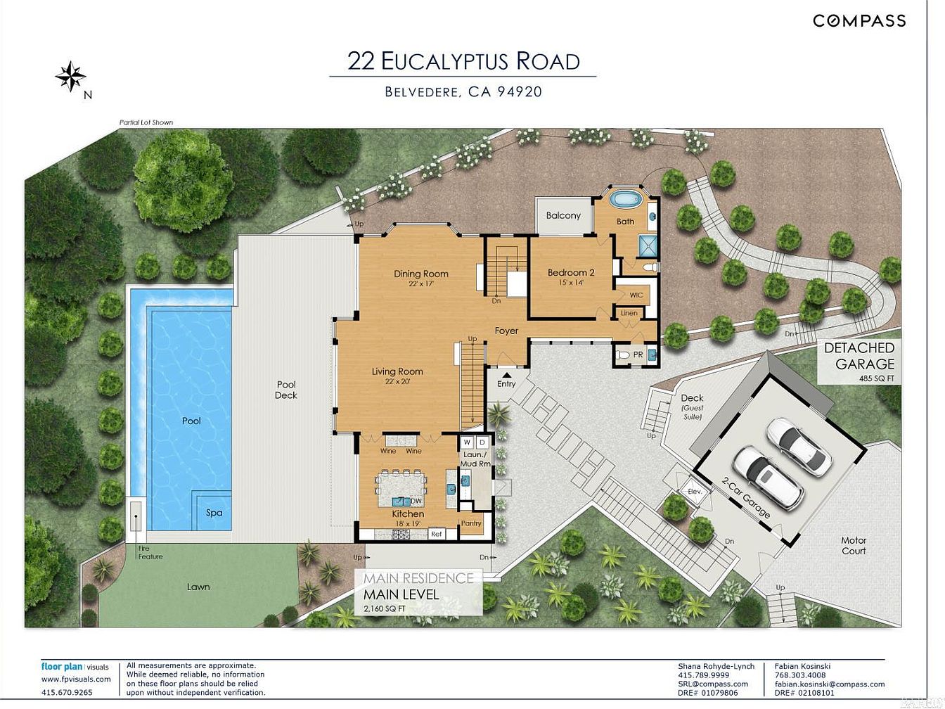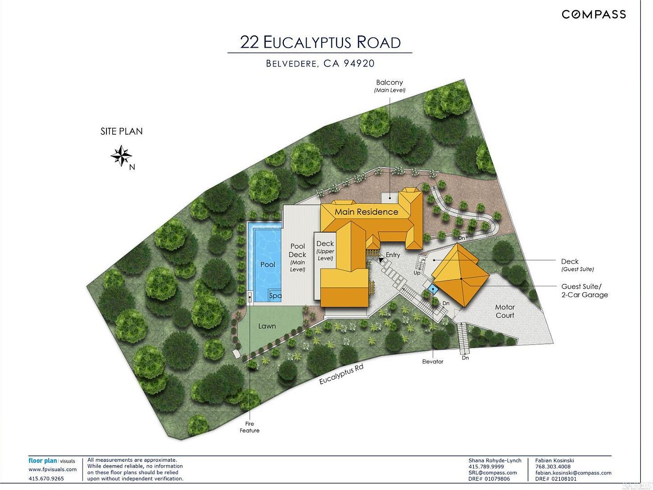This site plan presents a comprehensive view of a spacious property at 22 Eucalyptus Road, Belvedere, CA. The layout highlights a main residence with multiple levels, including an upper deck and a main-level pool deck adjacent to a rectangular swimming pool and spa. Surrounding the pool area is a lawn and a fire feature positioned in a lush, tree-filled landscape. To the right, a guest suite doubles as a two-car garage with a separate deck and motor court fronting the entry. The design incorporates terraced pathways, an elevator, and abundant greenery for privacy and natural beauty, blending functionality with elegant outdoor living spaces.