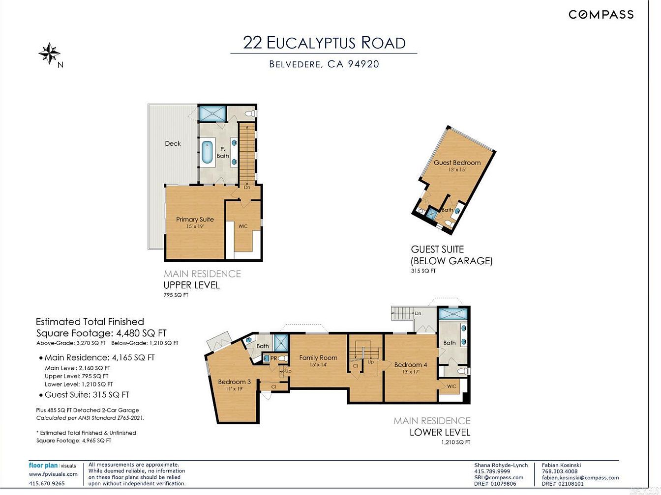 This detailed floor plan of 22 Eucalyptus Road highlights a multi-level home with a total finished area of 4,480 sq ft, including a guest suite below the garage. The upper level features a spacious primary suite with an adjoining deck and a large bathroom with dual sinks. The main level centers around living spaces (not shown) while the lower level contains bedrooms 3 and 4, a family room, and multiple bathrooms. The separate guest suite offers privacy with its own bath. The layout balances private and communal zones efficiently, supporting comfortable family and guest living. Architectural design focuses on clarity and flow.