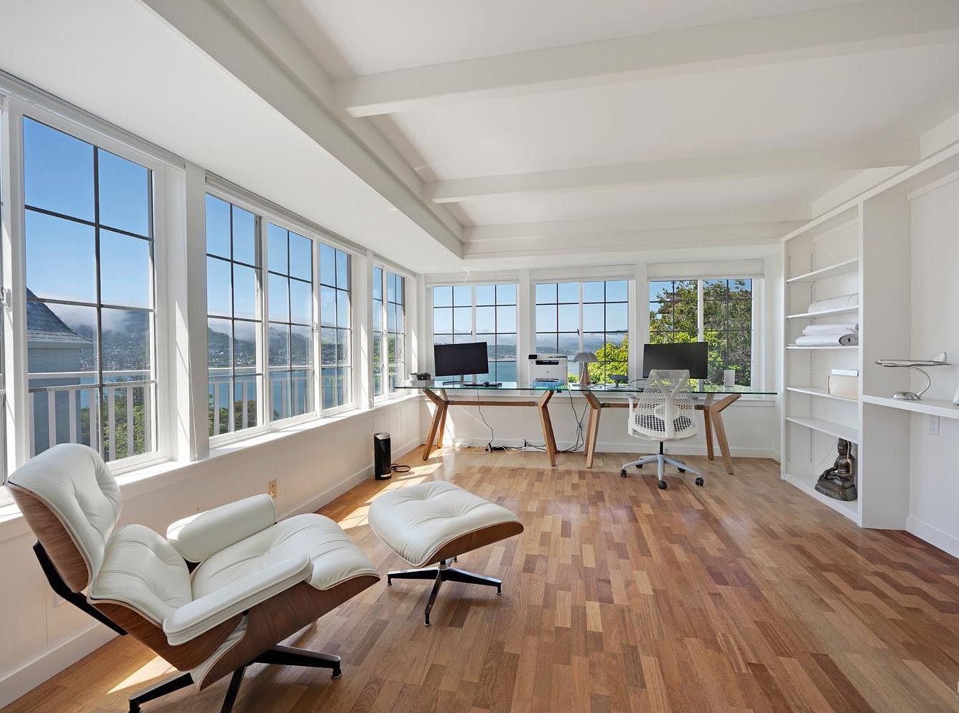 This spacious home office boasts an abundance of natural light due to the wraparound windows that offer panoramic views of a serene waterfront and distant hills. The room features a clean, modern design with white walls and ceiling accented by subtle beams, creating an airy, open atmosphere. Two sleek wooden desks with glass tops are positioned along the windows, each equipped with a computer and accessories, optimizing the view while working. The warm wood flooring contrasts beautifully with the crisp white furniture, including a stylish lounge chair and matching ottoman, perfect for relaxation. Built-in shelving on one side provides tidy storage with a minimalist touch.