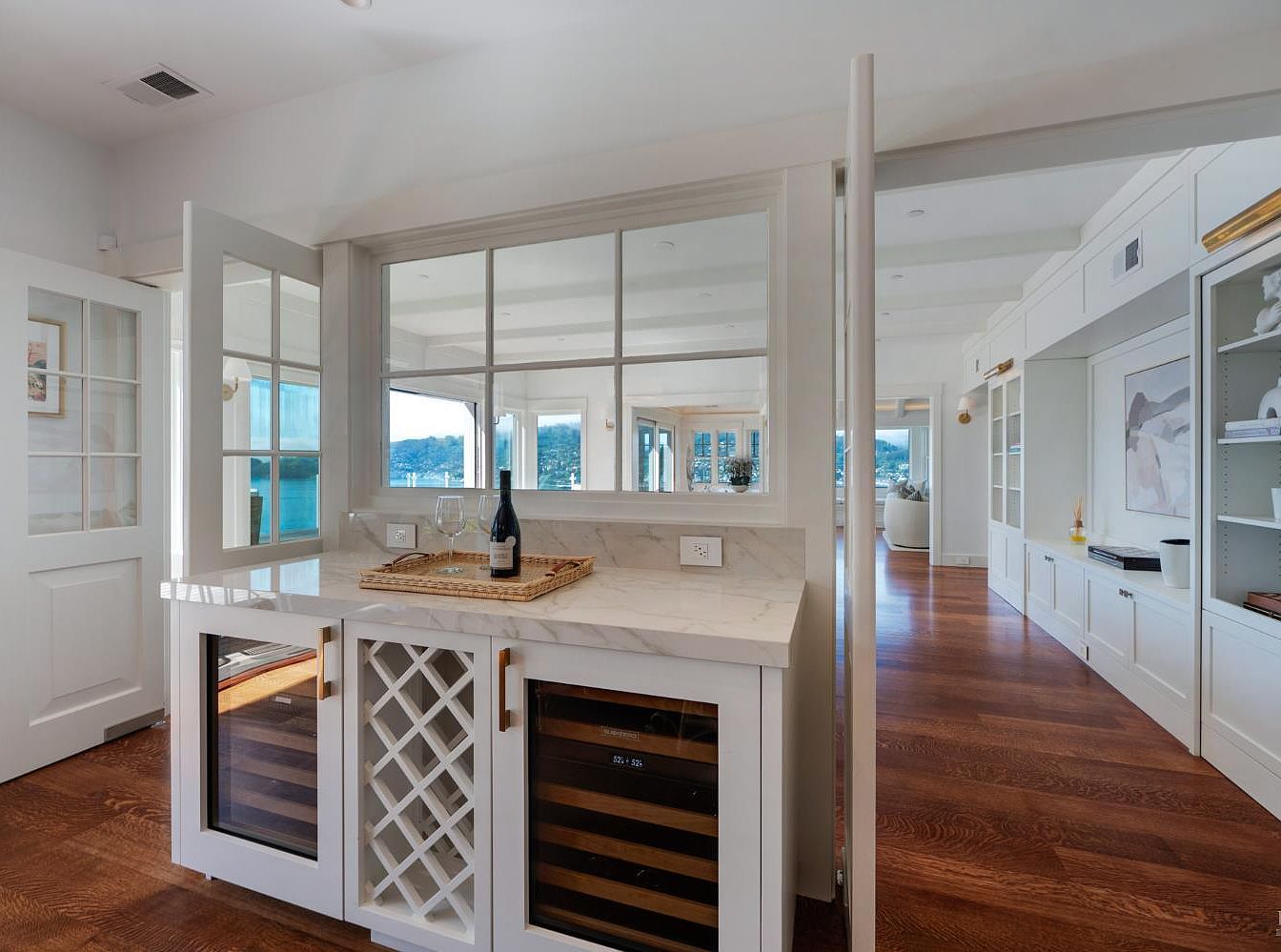 This elegant corner features a built-in wine bar with white cabinetry and a marble countertop, blending luxury with functionality. The cabinetry includes glass-fronted wine coolers and a lattice rack for bottle storage. Above the countertop, a large multi-pane window opens towards an adjoining room, adding a sense of spaciousness and connecting the areas visually. The warm wooden flooring contrasts beautifully with the bright white walls and cabinetry, creating a modern, airy atmosphere. The open glass doors and visible hallway with built-in shelves lined with art and decor lead into a bright, inviting living space with scenic views beyond.