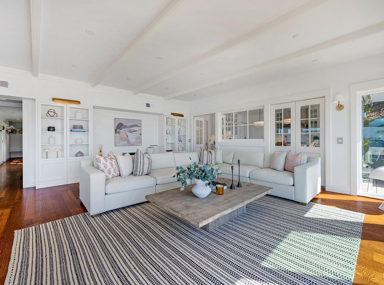 This spacious living room features a large, light beige sectional sofa arranged in an L-shape, creating an inviting space for gatherings. Soft, patterned throw pillows add subtle texture and comfort. A wide, low-profile wooden coffee table anchors the seating area atop a black and white striped rug, contributing to a modern, cozy vibe. White built-in shelves flank the back wall with decorative objects and ambient lighting above. The room is illuminated by natural light streaming through large windows and glass doors to the right. White walls, ceiling beams, and recessed lighting enhance the clean, bright, and airy aesthetic. Warm wood flooring adds contrast and warmth to the space.