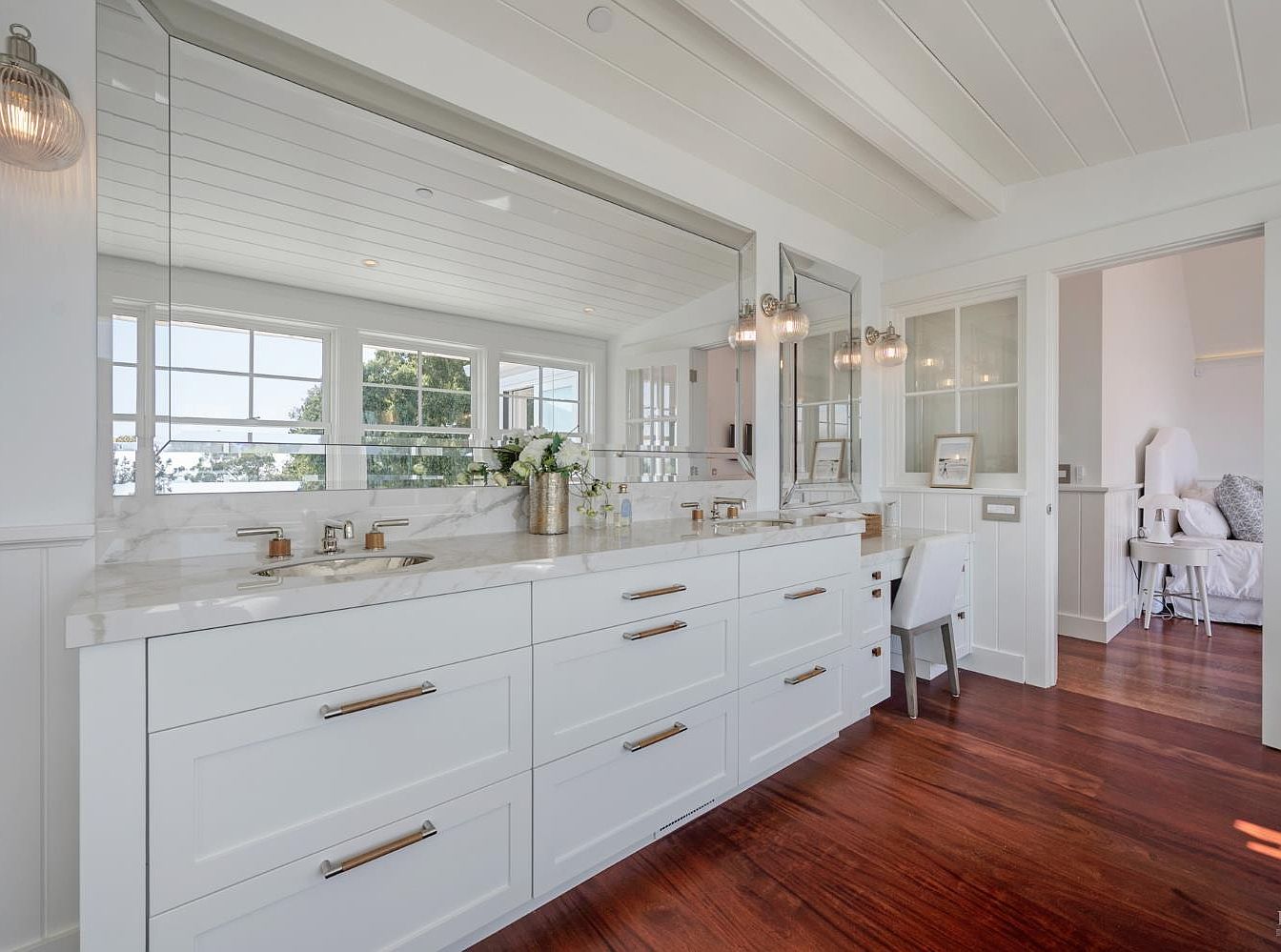 This bathroom features a wide, elegant double vanity with white cabinetry and sleek silver handles that complement the marble countertop. Two undermount sinks with modern fixtures provide practical functionality, while the large wall mirror spans the width of the vanity, amplifying natural light and adding spaciousness. Above the mirror, subtle wall sconces with ribbed glass shades emit a soft glow, enhancing the serene ambiance. White beadboard paneling and shiplap ceiling add texture and cottage charm, while rich, polished wooden flooring contrasts warmly with the otherwise crisp, clean white color palette. A small built-in vanity nook with a white chair offers a personal grooming area, adjoining a glimpse of a cozy bedroom beyond the open doorway.