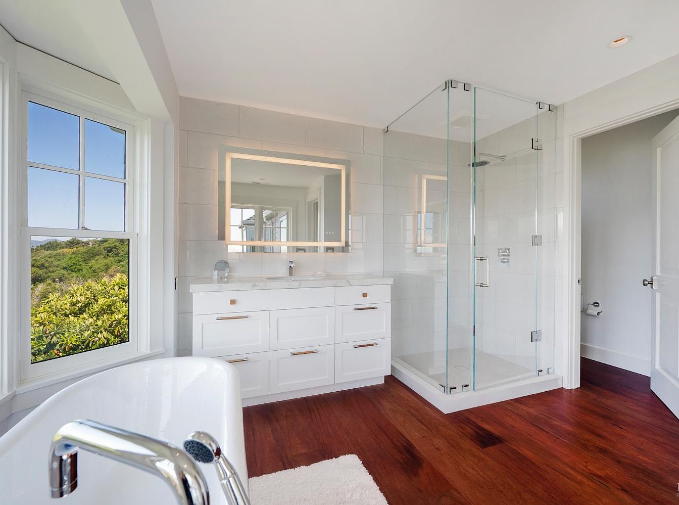 This bathroom features a clean, modern design with an emphasis on light and space. The warm, rich wooden floor contrasts beautifully with the predominantly white palette found in the cabinetry, walls, and fixtures. A freestanding bathtub with a sleek chrome faucet sits adjacent to a large window that offers natural light and scenic outdoor views. The white vanity has multiple drawers with simple hardware and is topped with a stone countertop beneath a backlit rectangular mirror. A frameless glass shower enclosure adds a contemporary touch, maintaining openness and openness in the layout. The overall aesthetic is fresh, airy, and inviting.