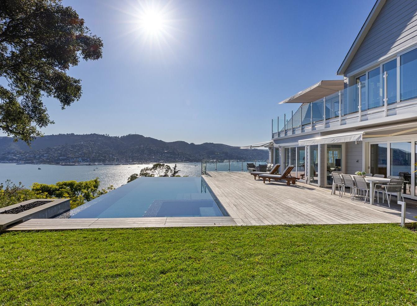 This serene outdoor space features an expansive wooden deck that seamlessly integrates a sleek infinity pool, creating a luxurious and tranquil retreat. The pale wood tones complement the soft gray siding of the modern home, while large glass doors open to invite natural light and panoramic views inside. The upper balcony, protected by glass railings, offers additional seating and shade with a retractable awning. The lush green lawn softly borders the deck, contrasting beautifully with the sparkling water and distant hills, emphasizing an elegant, coastal aesthetic designed for relaxation and entertaining.