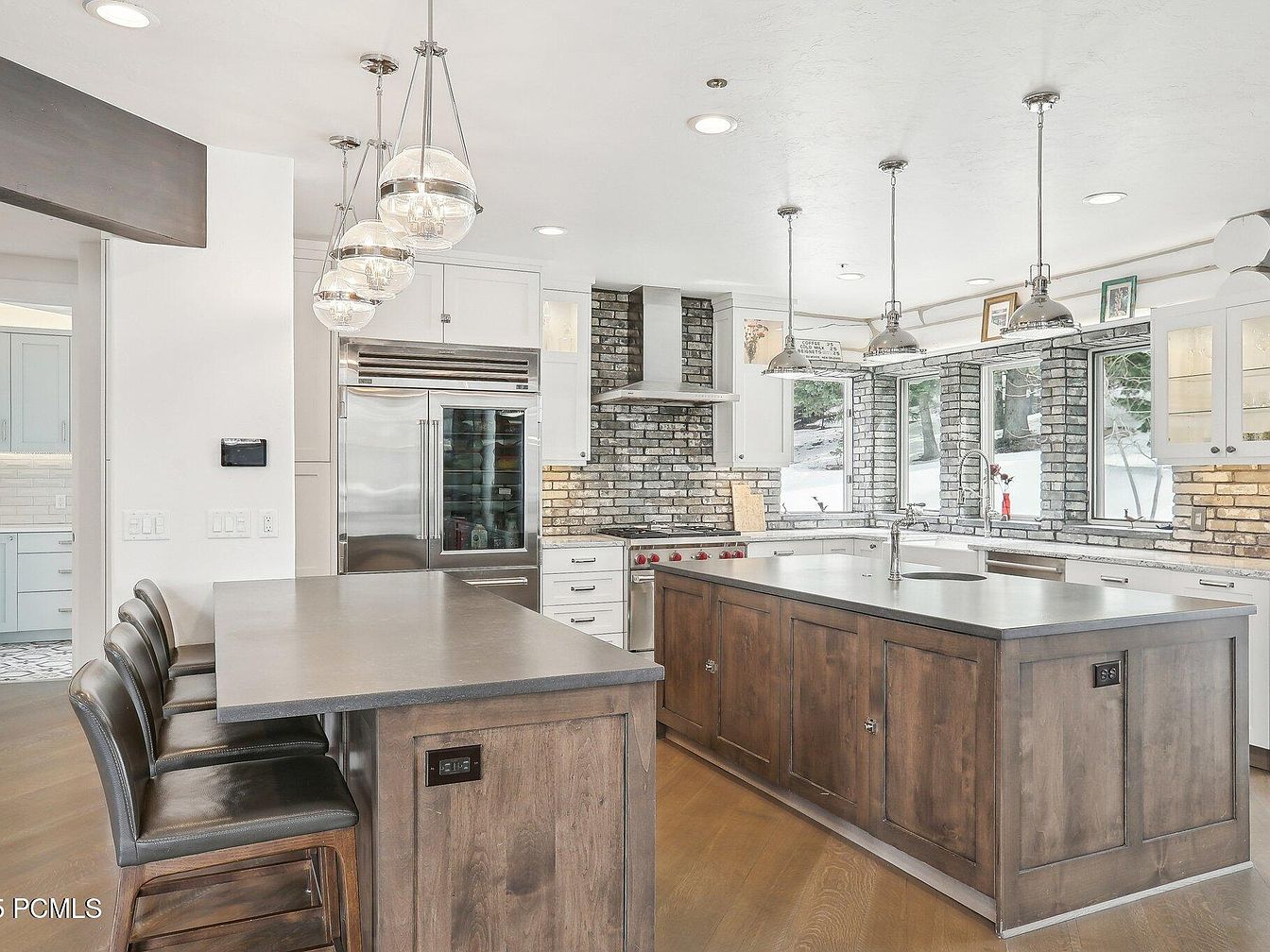 This kitchen features a spacious layout with two large wooden islands topped with smooth gray countertops, providing ample workspace and seating with comfortable black leather bar stools. The cabinetry combines warm dark wood on the islands with crisp white cabinets surrounding the stove and refrigerator. A striking mix of exposed brick walls in shades of white and gray adds texture and rustic charm, contrasted by stainless steel appliances and a sleek range hood. Multiple pendant lights, including globe-style and industrial fixtures, hang from the ceiling, casting bright, inviting light. Large windows offer plenty of natural light and views of snowy outdoors, enhancing the room’s airy and welcoming atmosphere.