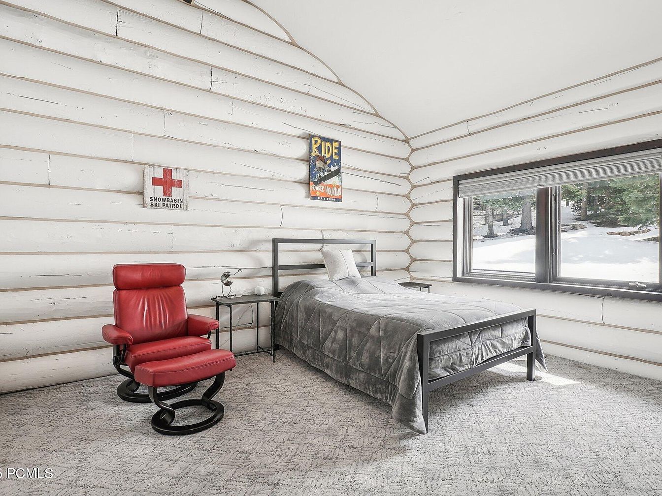 This bedroom features rustic whitewashed log walls that create a cozy cabin atmosphere with a modern twist. A simple black-framed bed with a grey quilted comforter anchors the space, positioned next to a large window that invites natural light and offers views of a snowy forest landscape. The flooring is covered with a soft, patterned light-grey carpet that enhances warmth underfoot. A bold red leather recliner with matching ottoman adds a pop of color and comfort, complemented by black metal side tables. Minimalist wall art reflects a love for skiing and mountain life, tying the room’s understated elegance with outdoor adventure charm.