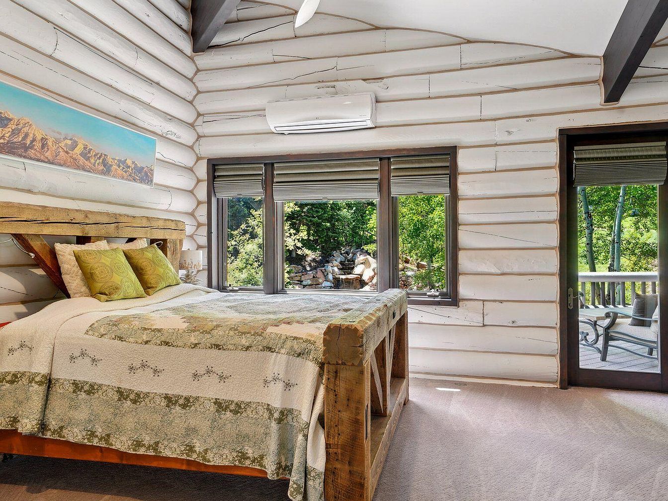 This inviting bedroom features a rustic charm with white-painted log walls creating a cabin-like ambiance. The wooden bed frame, robust with a handcrafted appearance, complements the earthy tones of the quilted bedspread accented by green and beige patterns. Large windows framed in dark wood welcome abundant natural light and showcase lush greenery and a peaceful water feature outside. A glass door leads to an outdoor seating area, blending indoor comfort with nature. The vaulted ceiling with exposed beams adds spaciousness, while a modern white air conditioning unit discreetly maintains climate control, balancing rustic aesthetic with contemporary convenience.