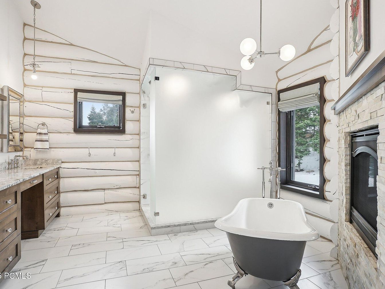 This bathroom exudes a clean, modern rustic charm with its whitewashed log walls accented by natural wood grains. The floor features large, marble-look tiles adding elegance and reflecting light elegantly. A freestanding clawfoot tub in a sleek black and white finish sits near a double window revealing a snowy outdoor view, enhancing the serene atmosphere. A glass-enclosed shower with tile trim stands prominently opposite a double vanity with rich dark wood cabinetry and granite countertops. A stone fireplace carefully integrated into the wall introduces warmth and a cozy focal point, while a polished, minimalistic light fixture brightens the vaulted ceiling space.