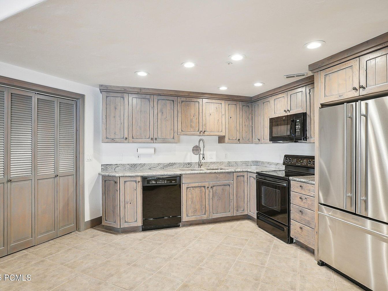 This kitchen features a clean, spacious corner layout with rustic-style cabinetry that has a weathered wood finish, adding warmth and character. The countertops are a polished granite with subtle gray veining that complements the cabinets. Stainless steel appliances, including a large French door refrigerator, contrast with the black stove, microwave, and dishwasher, balancing modern functionality with traditional aesthetics. The floor is tiled in neutral beige tones, and recessed ceiling lights provide bright, even illumination. Adjacent to the cabinets, louvered wooden closet doors offer additional storage, enhancing the room’s organized and welcoming feel.