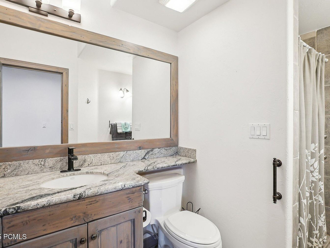 This bathroom showcases a cozy, well-organized vanity space combining rustic and modern elements. A large wooden framed mirror with a light natural finish emphasizes the earthy aesthetic, complementing the granite countertop with its intricate marbling patterns. Below, the cabinetry in a matching wood tone offers storage, marked by simple round knobs. A matte black faucet adds a subtle industrial touch, contrasting beautifully against the lighter stone and wood tones. The toilet sits neatly beneath the extended countertop. Neutral off-white walls create a bright and clean atmosphere, while a glimpse of a shower curtain with a soft floral pattern adds a delicate decorative accent.
