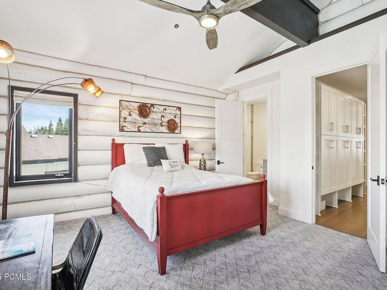 This master bedroom blends rustic charm with modern comfort. The whitewashed log walls add a cozy, cabin-inspired ambiance, contrasted by the bold red wooden bed frame as the room’s centerpiece. Soft gray carpet covers the floor, contributing warmth and softness underfoot. A unique metal wall art piece above the bed enhances the space with an artistic touch. Natural light flows in from a rectangular window, offering views of greenery outside. Open doors reveal an adjoining bathroom and hallway lined with built-in white cabinetry, combining functionality with clean, minimalist aesthetic. An overhead ceiling fan with wood blades complements the high ceiling with exposed beams, enhancing air circulation while adding a refined architectural detail.