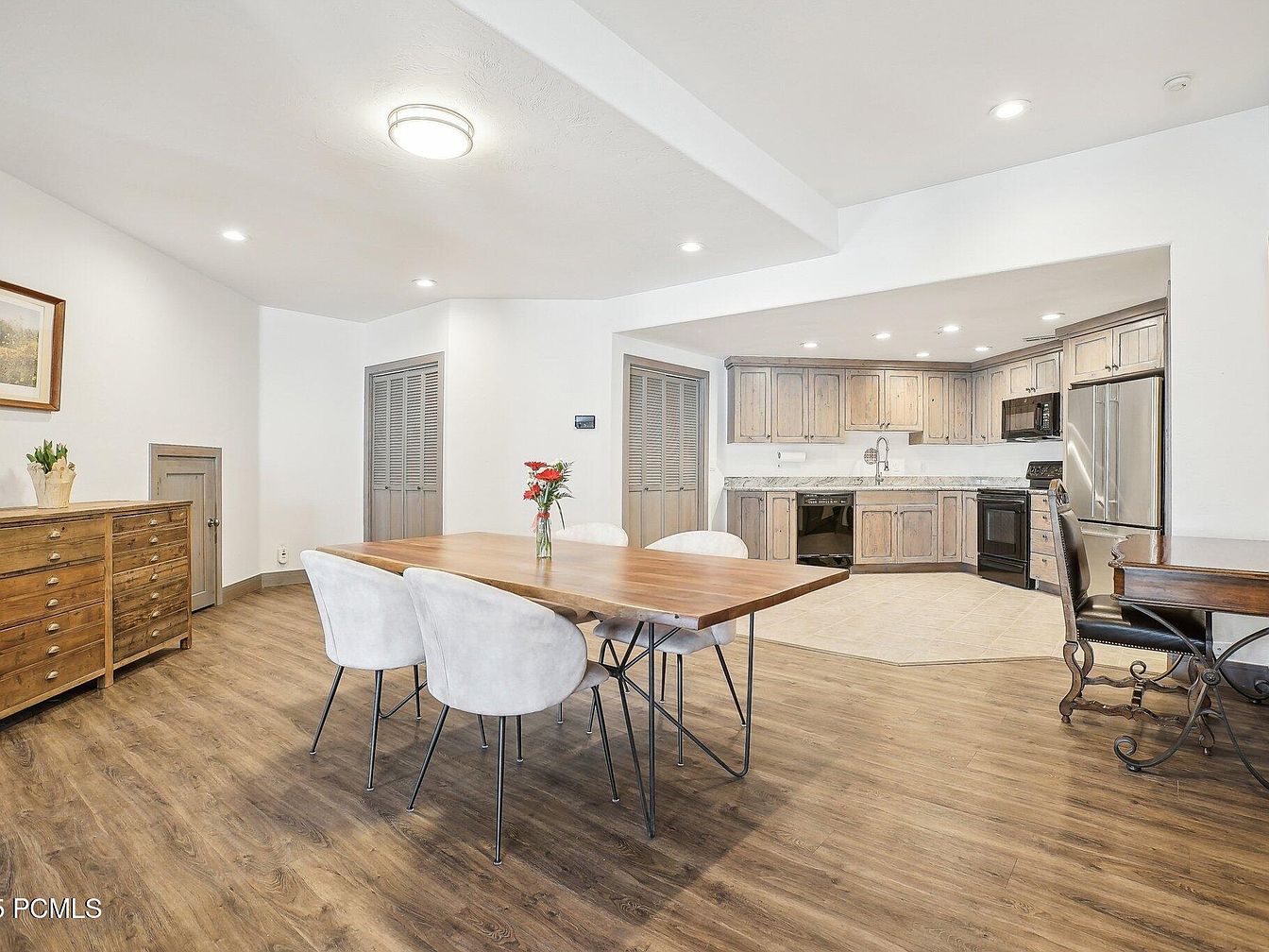 This open-concept kitchen and dining space boasts a warm and inviting atmosphere with natural wood tones dominating the design. The kitchen features light-stained wooden cabinetry with rustic details paired with modern stainless steel appliances, including a refrigerator and a stove with an over-the-range microwave. The countertop is a pale granite or marble, complementing the cabinetry. Recessed lighting in the ceiling brightens the space evenly. The dining area hosts a large wood slab table with a live edge finish and black metal legs, surrounded by cushioned beige upholstered chairs. Neutral walls and wood-look flooring unify the spaces, while minimal decor enhances the clean, contemporary feel. Doors lead toward a bedroom and other areas, indicating a fluid transition between living spaces.