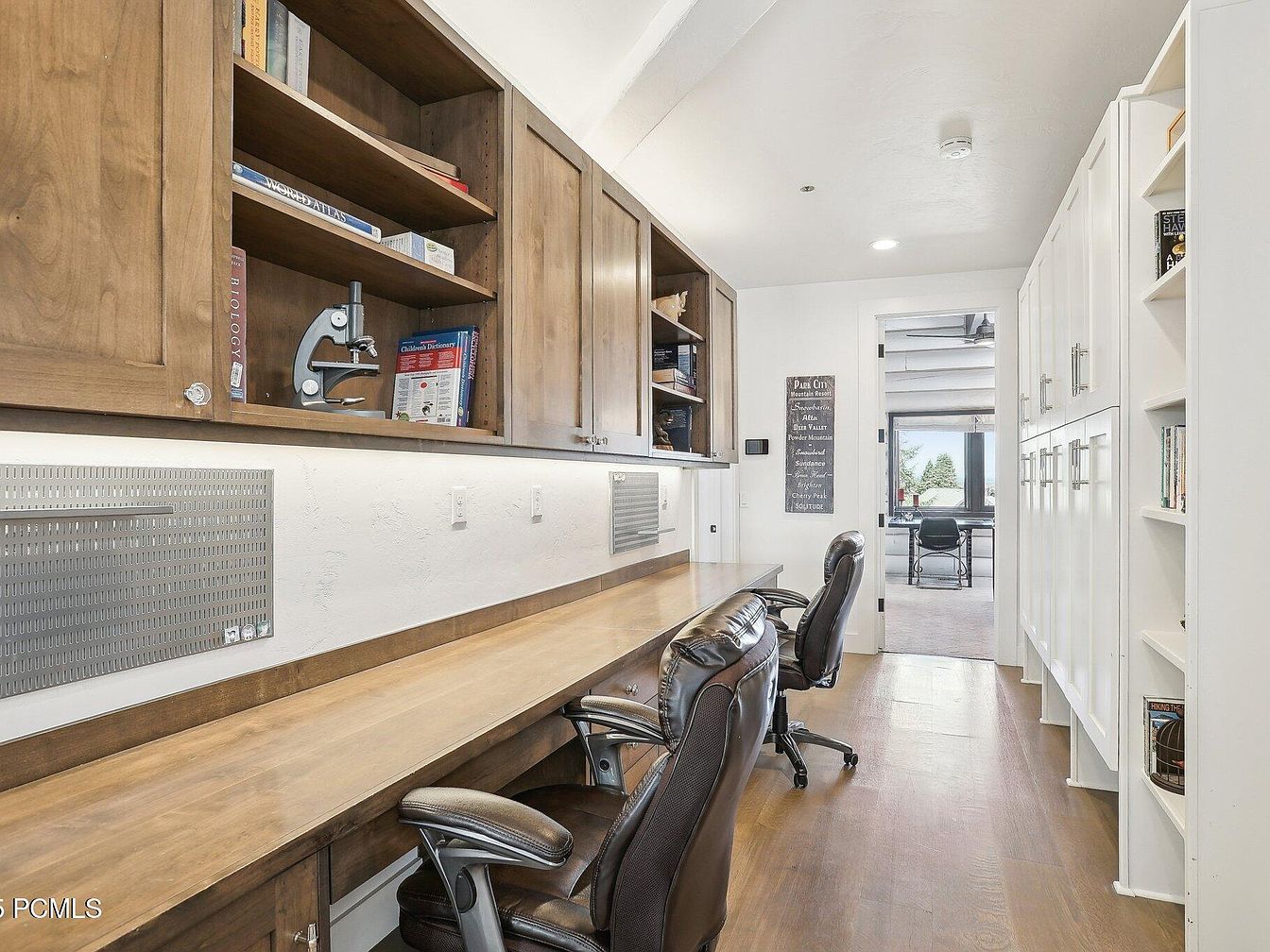 This long, narrow home office features a streamlined, efficient design with a continuous wooden desk spanning one side of the room, paired with two black ergonomic swivel chairs. Above the desk, wooden upper cabinets and shelves offer ample storage and display space, combining open shelving with closed cabinetry in warm, natural wood tones. Opposite these, white cabinets with modern silver handles provide additional storage, balancing the warmth with a clean, bright contrast. The room is brightly lit with recessed lighting and natural light streaming in from an adjoining room visible through a doorway at the far end. The overall aesthetic blends functionality with inviting, earthy materials.
