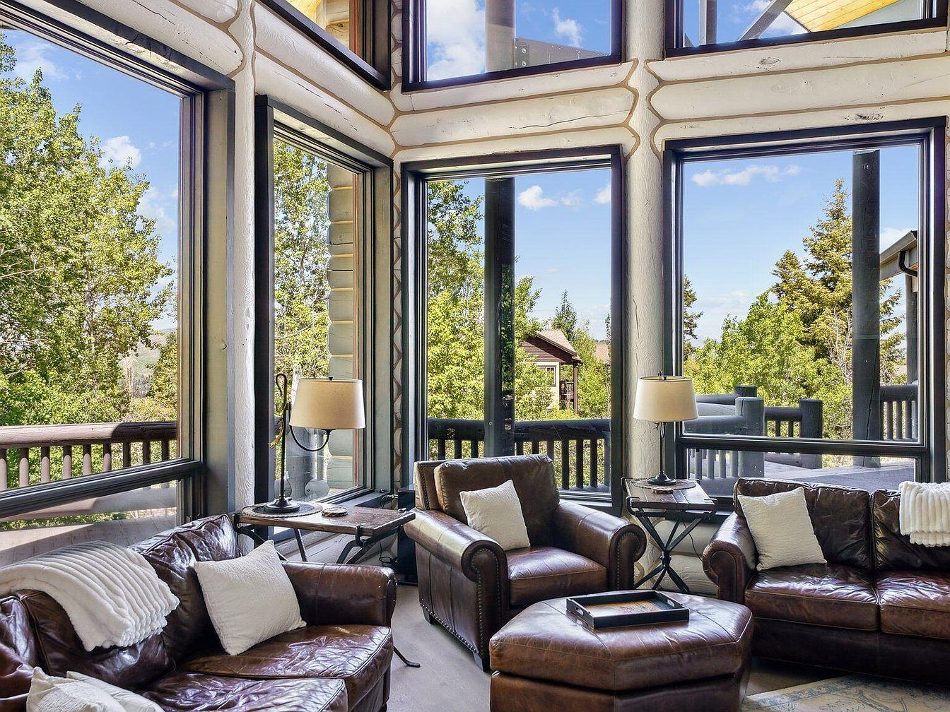 This cozy living room corner features rich, dark brown leather armchairs and a matching sectional sofa that invite relaxation. The seating is accented by plush white pillows and a soft white throw, providing contrast and warmth. Large floor-to-ceiling windows wrap around the space, flooding it with natural light and offering serene views of lush greenery and a wooden deck outside. The walls are made of whitewashed logs with dark trim, blending rustic charm and modern clean lines. Iron-framed side tables with beige lamps add a subtle industrial elegance to the inviting atmosphere.