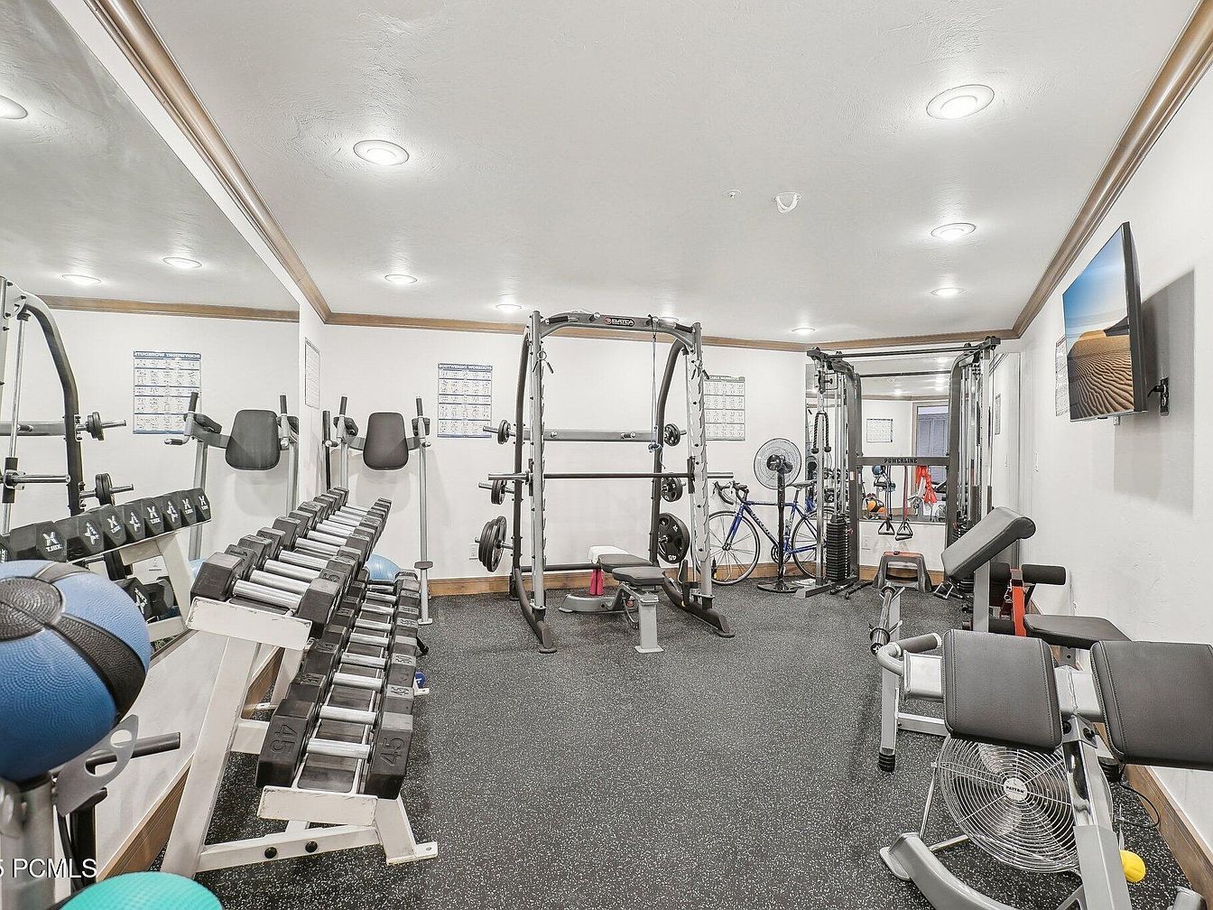 This dedicated fitness room is designed with functionality and efficiency in mind. The space features a broad selection of exercise equipment including a rack of dumbbells, weight bench, multi-functional cable machine, and other strength-training apparatus. The floor is covered with speckled rubber matting for protection and comfort during workouts. Walls are painted white with a natural wood trim along the ceiling, lending a clean and neutral palette that is brightened further by recessed ceiling lights. Large mirrors on two adjacent walls visually expand the room while allowing form checks during exercise sessions. A mounted flat-screen TV adds entertainment options, making this a comprehensive and inviting space for personal fitness.