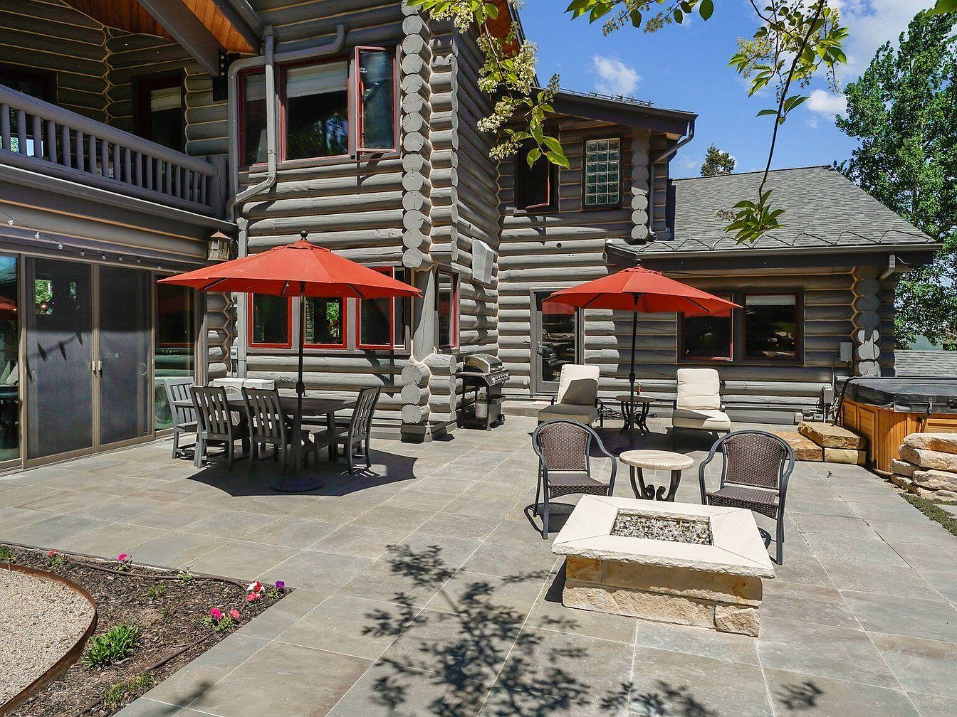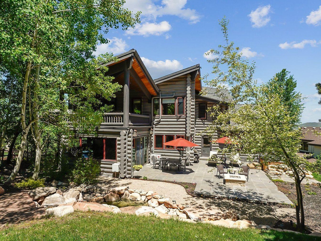 This spacious backyard patio is anchored by a rustic log cabin-style home with expansive wooden beams and a natural wood finish. The outdoor area features a large gray stone-tiled patio with outdoor dining sets accented by vibrant red umbrellas, offering a cozy place for gatherings. A fire pit with surrounding chairs adds warmth and ambiance. Natural landscaping with mature trees and shrubs surrounds the space, while a small artfully arranged rock garden and water feature enhance the serene, nature-inspired aesthetic. The clear blue sky and verdant greenery complete this inviting outdoor living environment.