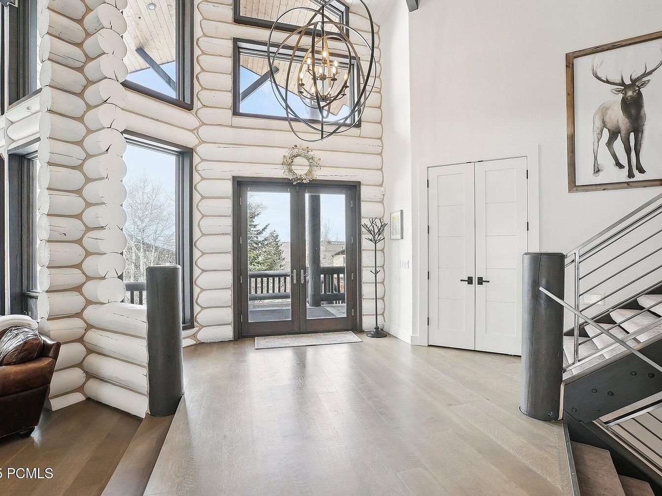 A spacious entryway framed with whitewashed log walls sets a modern rustic tone, enhanced by large windows inviting natural light and views of the outdoors. The double glass doors lead to an exterior deck, contributing to an airy, open feel. A distinctive spherical chandelier hangs from the soaring ceiling, adding an industrial-modern touch. Light hardwood floors extend throughout, complementing the neutral palette. To the right, a modern staircase with sleek metal railings and dark posts contrasts warmly with the white walls. A tasteful elk artwork hangs above, grounding the space with a natural motif.