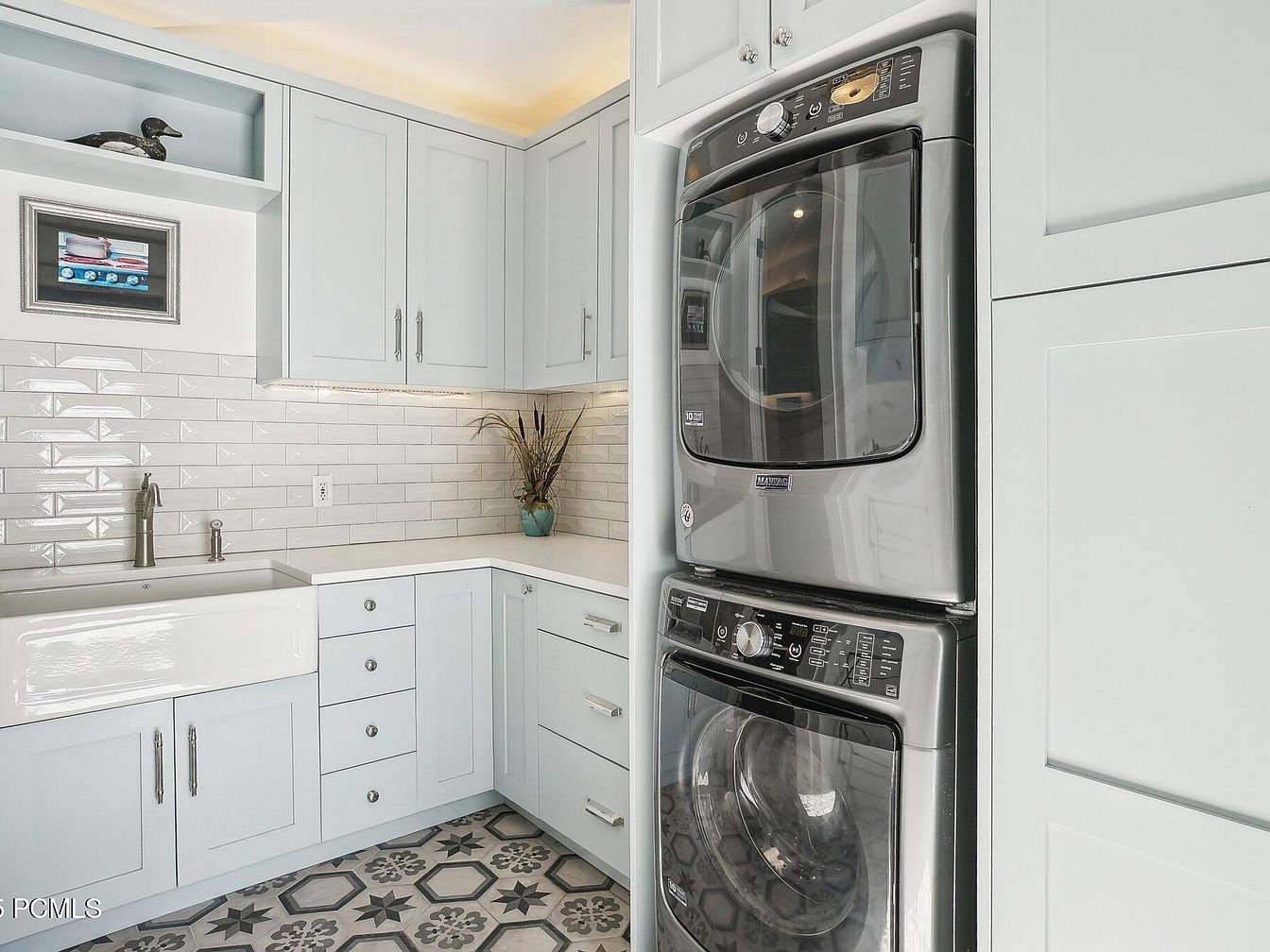 This laundry room features a clean and bright layout with light blue cabinetry that offers ample storage space above and below the countertop. A modern farmhouse-style white apron sink sits beneath a sleek metallic faucet, complementing the surrounding cabinets. The stacked washer and dryer in a stainless steel finish add a contemporary touch while maximizing floor space. The backsplash is composed of glossy white subway tiles that reflect light and enhance the airy feel. The patterned tile floor brings a subtle geometric charm with shades of gray and blue, grounding the room’s soft color palette. Decorative elements include a small shelf with a bird sculpture and a framed picture, adding personal warmth to the functional space.