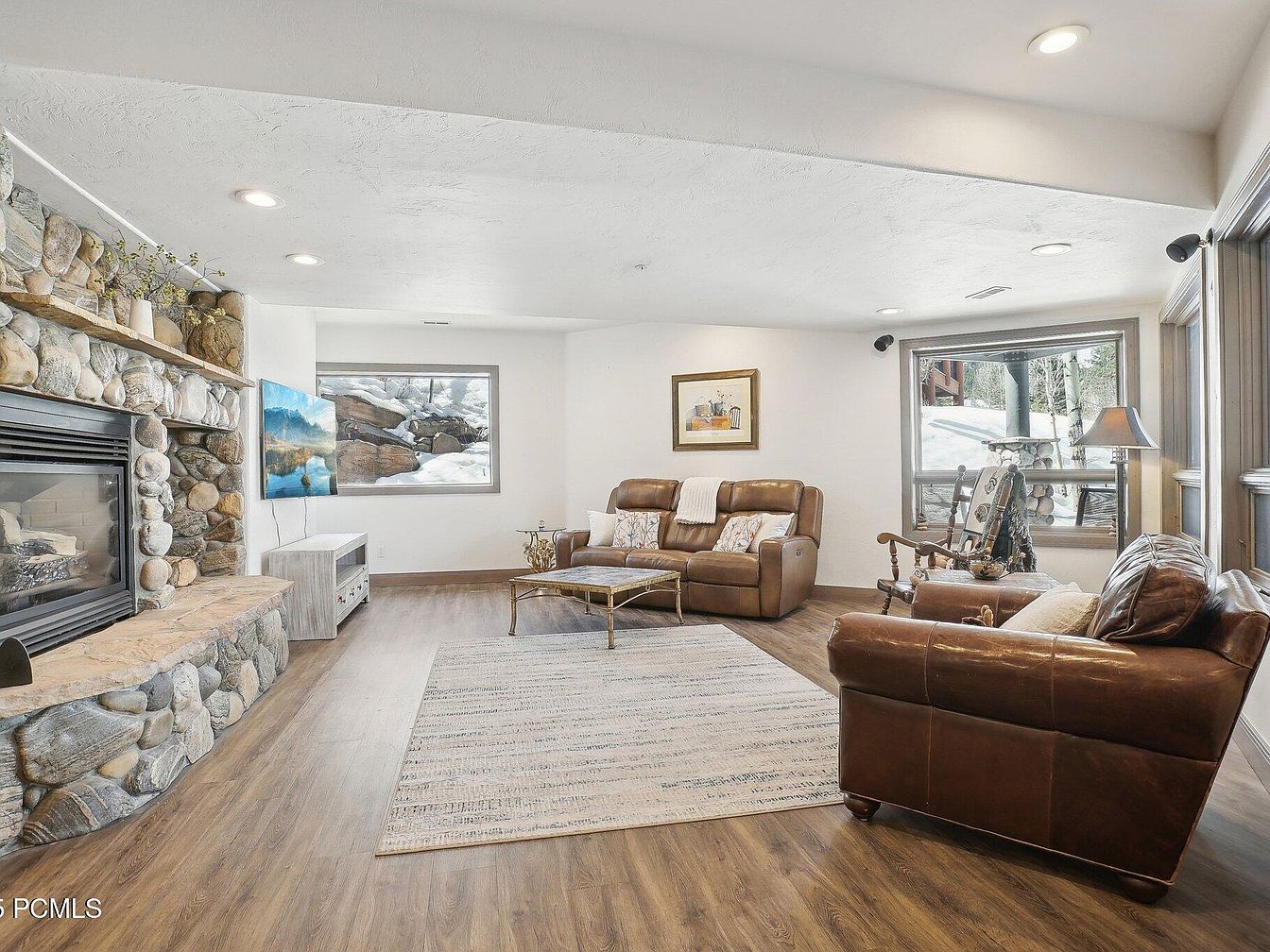 This living room offers a warm and inviting atmosphere centered around a natural stone fireplace with varied river rock textures that enhance the rustic charm. The space features rich wood flooring that complements the caramel leather loveseat and reclining sofa, creating a cohesive color palette of warm browns and neutrals. Framed windows on two walls bring in natural light and scenic snowy views, adding depth and brightness. A simple, light-hued area rug anchors the seating arrangement, while recessed ceiling lights provide soft illumination. The décor is minimal with a framed artwork and a small side table, emphasizing comfort and natural elements.