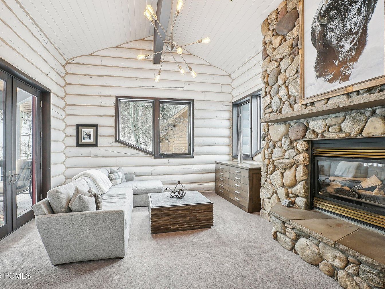 This inviting living room features a vaulted ceiling with whitewashed log walls that create a bright, airy cabin ambiance. The large stone fireplace with rounded river rocks serves as the dramatic focal point, complemented by a rustic wooden mantel and a framed bison print above. A modern gray sectional sofa with plush cushions faces a unique wooden coffee table centered on a soft, neutral carpet. Black-trimmed windows flank the room, allowing natural light to filter in and providing serene outdoor views. A contemporary chandelier with exposed bulbs hangs overhead, blending modern and rustic styles seamlessly.