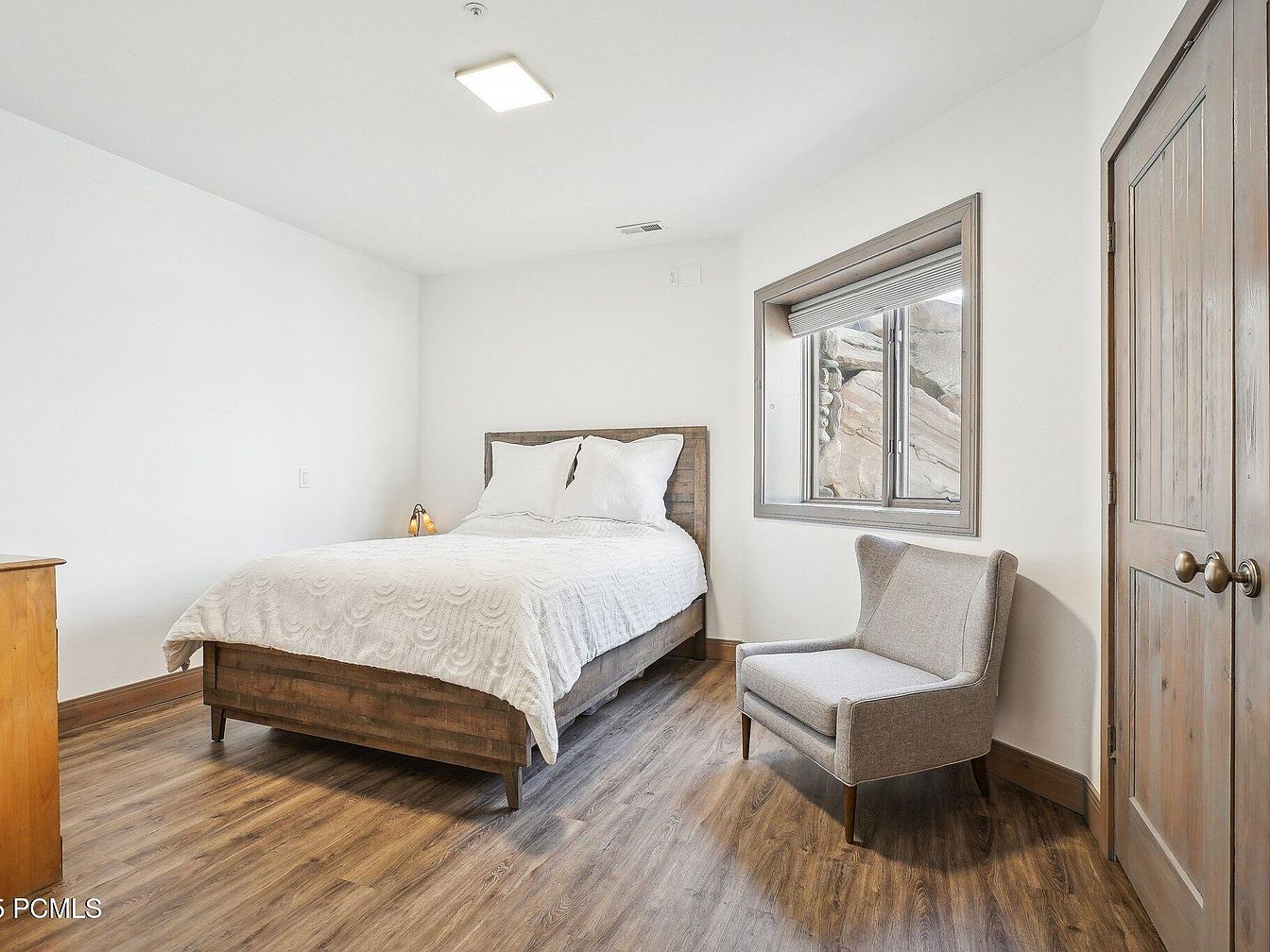 This serene bedroom features a minimalist design with white walls creating a clean and bright atmosphere. A wooden bed frame with rustic tones anchors the space, topped with crisp white bedding for a fresh look. The flooring is a warm, natural wood that complements the bed frame and the wooden trim around the window and door. A plush light gray armchair in the corner offers a cozy, inviting spot to relax. The window, framed in wood, provides natural light and a rugged stone exterior view, adding a natural element to this simple, restful retreat.