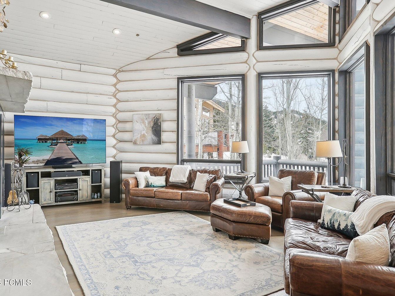 This spacious living room features a rustic yet refined aesthetic, centered around rich brown leather seating including a sofa, loveseat, and armchair with matching ottoman. Large floor-to-ceiling windows framed in dark trim bathe the space in natural light and showcase an inviting view of winter trees and mountain terrain. The walls are finished with whitewashed log paneling that adds texture and volumetric interest. A soft, patterned area rug in light shades anchors the sitting area atop smooth flooring. Accents like cushions with nature-inspired patterns and a wooden TV stand give warmth, while modern lighting and clean lines maintain a cozy yet contemporary vibe.