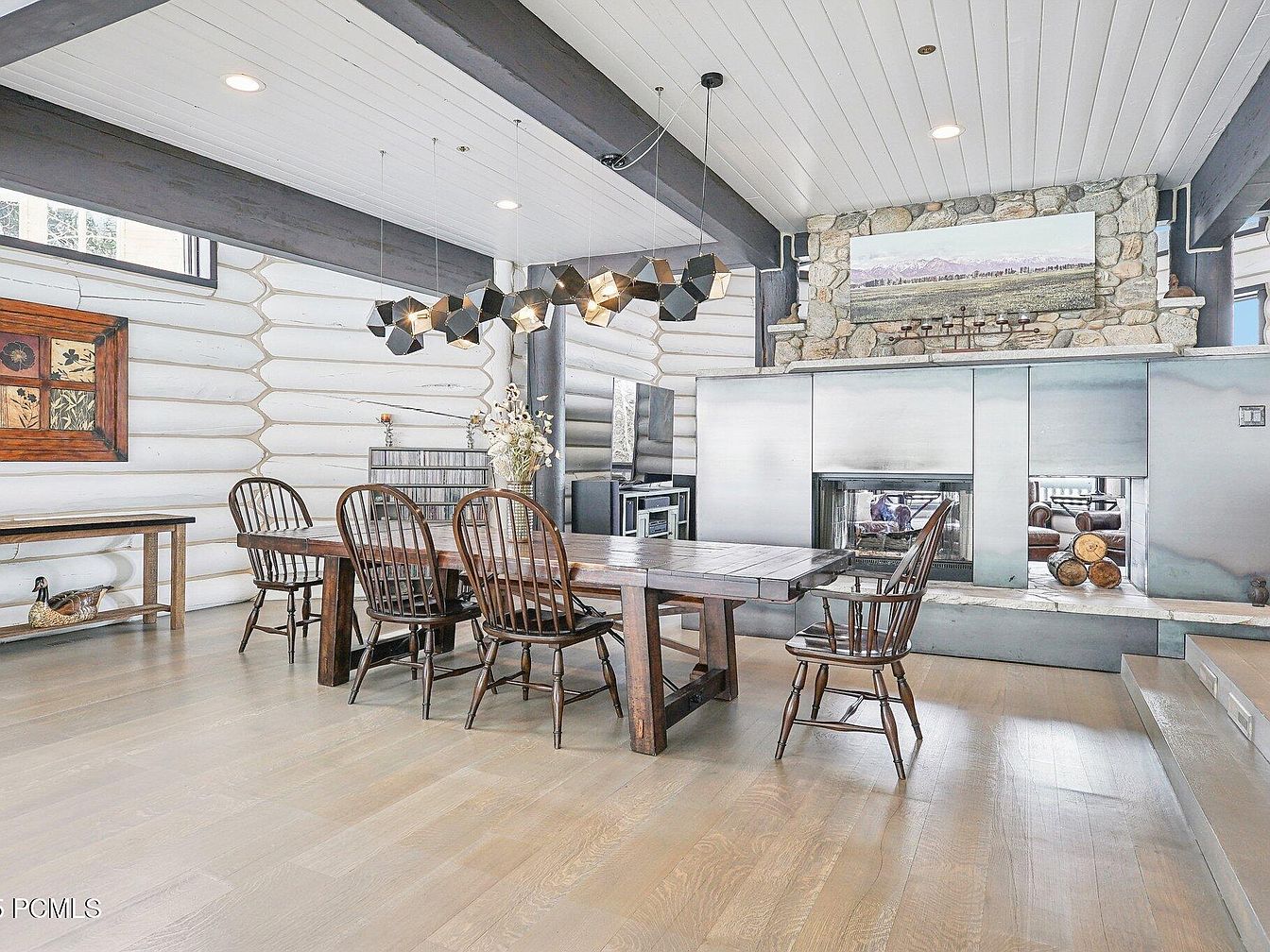This spacious dining area features a long wooden table surrounded by six classic spindle-back chairs, providing ample seating for gatherings. The light hardwood floors complement the whitewashed log walls and ceiling, which are accented by dark exposed beams that add architectural interest. A modern, geometric black pendant light fixture hangs above the table, enhancing the contemporary touch. Opposite the dining space, a large stone fireplace with a built-in log storage nook offers warmth and rustic charm. Subtle décor, including a floral arrangement and framed artwork, completes this inviting and balanced blend of rustic and modern aesthetics.