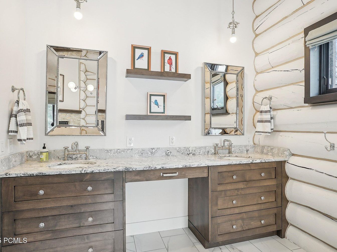 This bathroom features a spacious double vanity with a natural stone countertop boasting subtle gray veining that complements the dark wood cabinetry underneath. Two framed mirrors with reflective beveled edges hang above each sink, enhancing the light and airy atmosphere. A pair of wall-mounted towel rings with striped hand towels flank the vanity on either side. The backdrop includes crisp white walls and a rustic log cabin texture painted white, providing warmth and character. Two simple, exposed bulb light fixtures add a modern touch, while floating shelves display delicate bird artwork, creating a cohesive yet inviting space.
