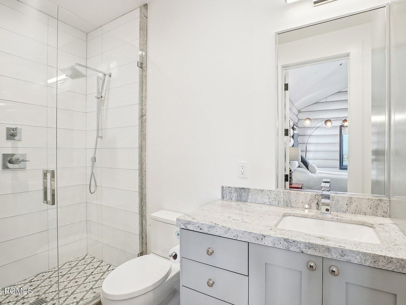 This bright bathroom features a sleek, minimalist design with white walls and large horizontal white tiles lining the walk-in shower. The glass shower enclosure enhances openness, while the patterned tile floor adds subtle textural interest. A white porcelain toilet sits adjacent to a light grey vanity topped with a gray and white speckled granite countertop, housing a modern rectangular sink. The vanity’s simple cabinetry and round chrome knobs emphasize clean lines. Above, a large mirror reflects an adjacent room, adding depth and continuity. Overall, the design balances functionality with contemporary understated elegance.