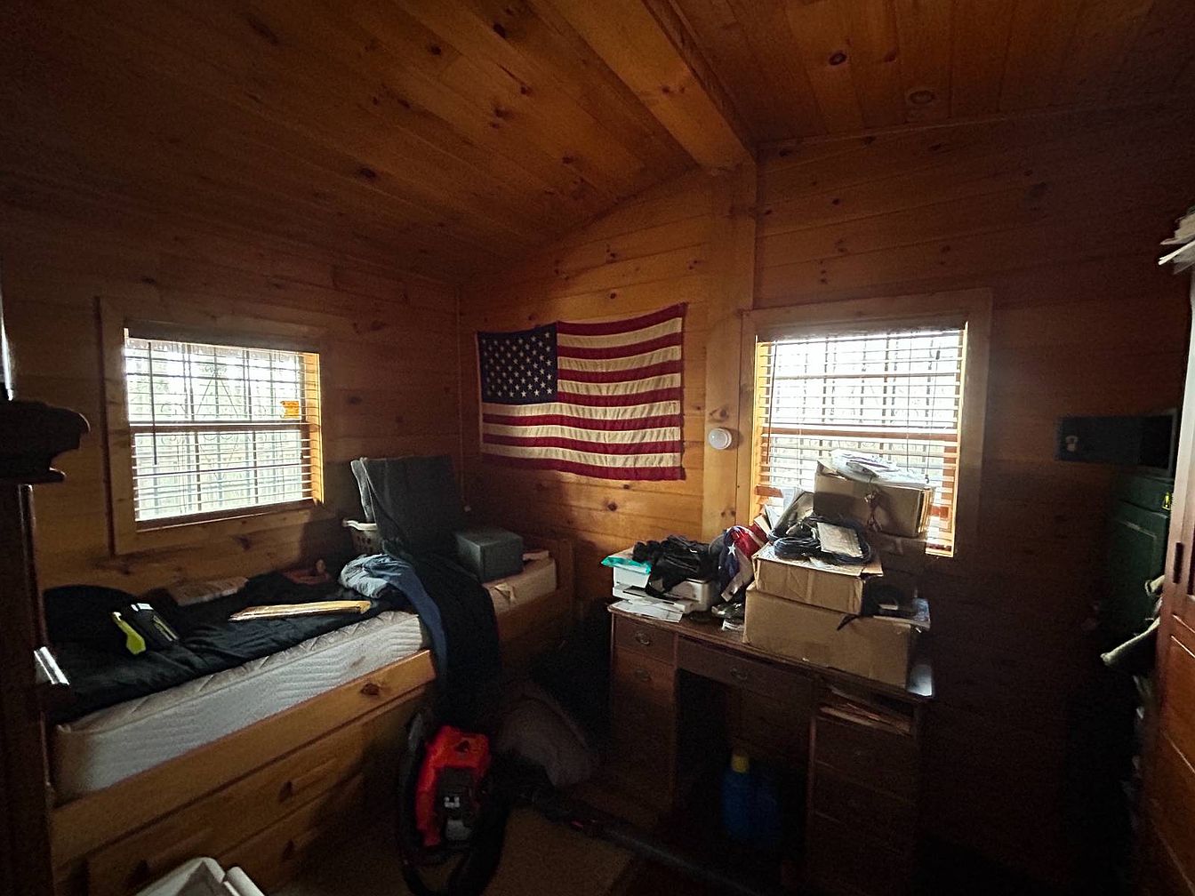 This snug corner of the home combines functionality with rustic charm through an all-wood, knotty pine interior that envelops the space warmly. Twin windows with horizontal blinds allow natural light to filter softly, illuminating a built-in wooden daybed with under-bed drawers, ideal for compact living. An American flag hung on the wall adds a patriotic touch. A sturdy desk cluttered with boxes and personal items sits beneath the second window, balancing the room’s multipurpose use. The natural wood tones, mixed with casual, lived-in elements, create a cabin-like retreat with a utilitarian vibe.