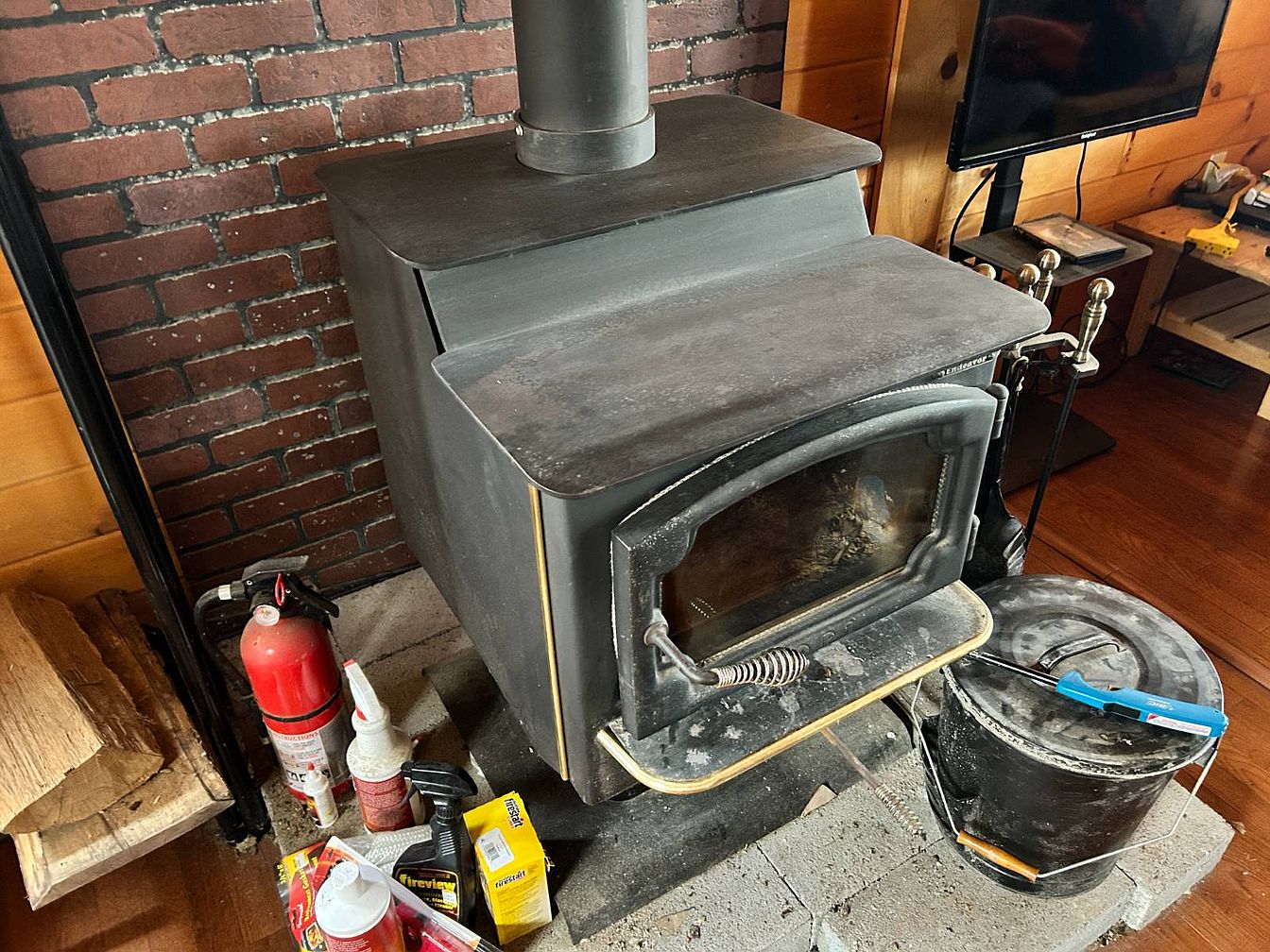 This cozy corner features a classic black cast iron wood stove sitting on a stone hearth, bordered by a red brick backdrop for heat protection and rustic charm. A stack of cut firewood rests to the left, emphasizing practicality and warmth. Surrounding the stove are fire-starting essentials including a fire extinguisher, various sprays, and kindling products, ensuring safety and easy maintenance. To the right, a black metal ash bucket and fireplace tools complete the setup. The surrounding wooden walls and warm-toned flooring enhance the inviting, cabin-like atmosphere.
