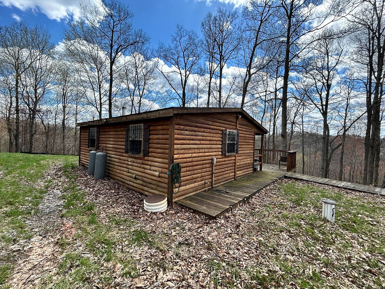 This property features a charming rustic cabin showcasing a traditional log cabin architectural style, nestled atop a hill with panoramic views in Mannington, West Virginia. The cabin offers a cozy living space with one bedroom and one bathroom, surrounded mostly by wooded acreage with a cleared area immediately around the home. Inside, the cabin boasts hardwood floors throughout the living area, equipped with a propane stove and refrigerator. Additional structures on the property include a detached storage building and a storage shed, adding to the utility of the site. The entire plot covers approximately 32.04 acres as assessed, providing abundant natural space and privacy. The listing price is $94,900.
