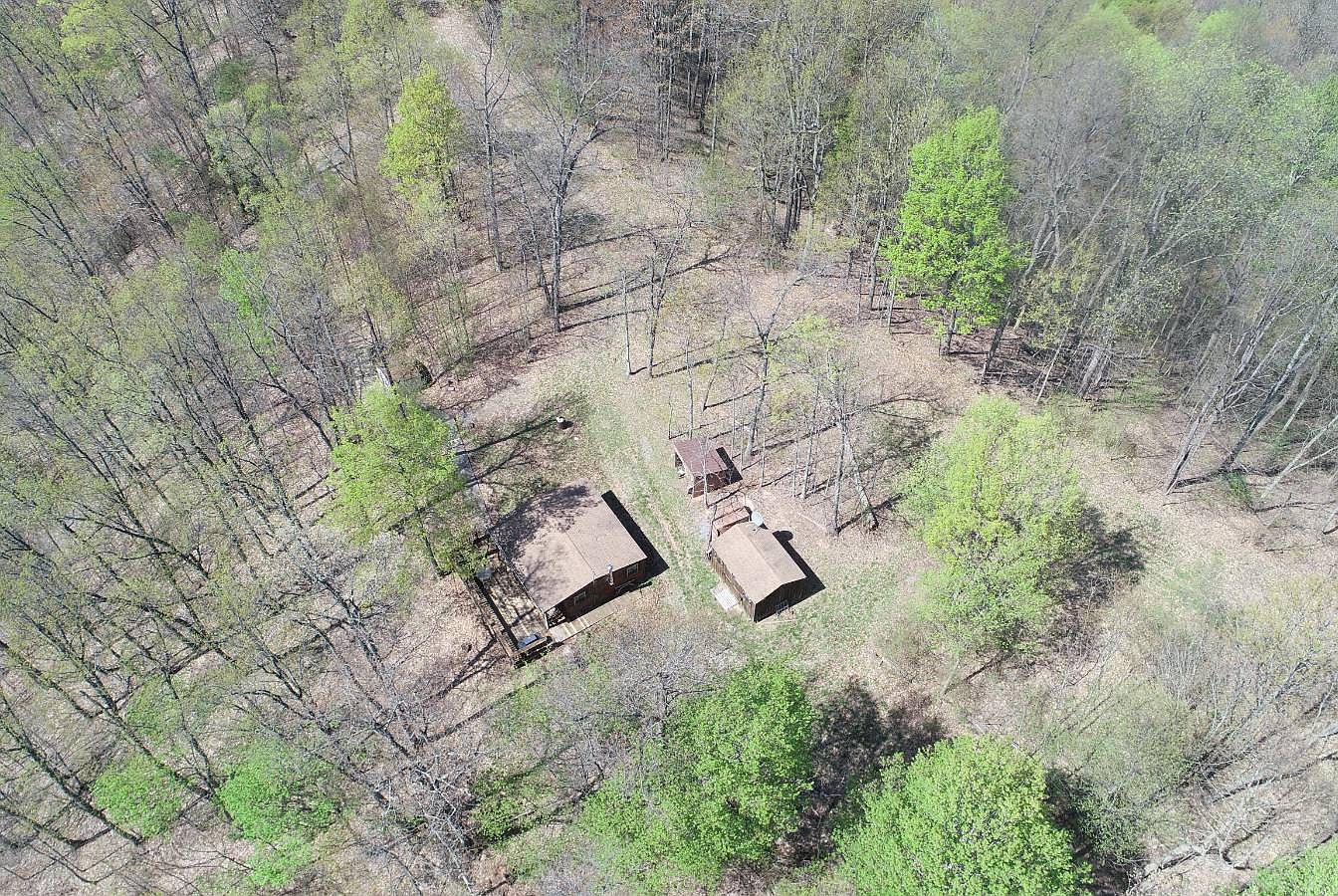This serene woodland setting features a modest cabin and an adjacent smaller structure nestled among tall, leafless and lightly green trees, indicative of early spring. The natural landscape is dense with mature deciduous trees that create a secluded and peaceful atmosphere. A narrow dirt path connects the two buildings, providing easy access between them. The buildings’ brown rooftops and rustic materials blend harmoniously with the earthy tones of the forest floor, emphasizing a simple, nature-integrated lifestyle. This peaceful retreat offers privacy and quiet, perfect for nature lovers seeking a woodland sanctuary.