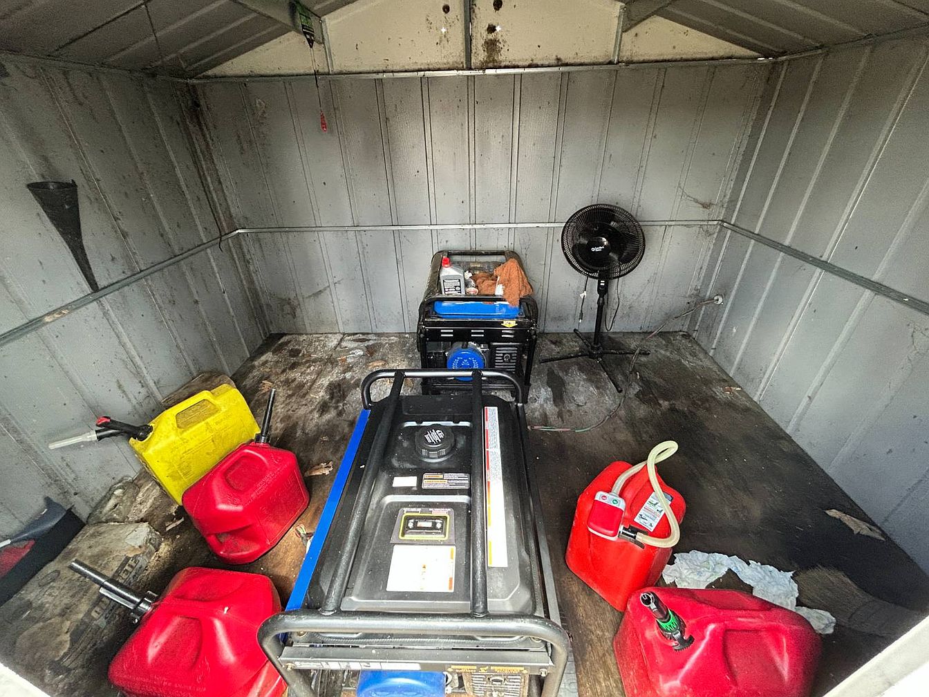 This compact utility shed features corrugated metal walls and ceiling, presenting a raw, industrial feel. The floor appears worn and stained, demonstrating frequent use and practical functionality over aesthetics. Inside, several red and yellow fuel containers are scattered around two portable generators positioned centrally, indicating storage for power equipment. A black oscillating standing fan in the right corner adds a functional touch for ventilation. The structure is utilitarian, focused on storage and maintenance tasks, with a simple and rugged design. Natural light is limited, and electrical conduit piping runs horizontally around the shed’s perimeter for essential wiring needs.