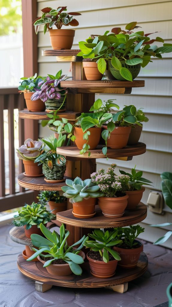 A tiered plant stand is a freestanding option that provides multiple levels for displaying plants. It’s perfect for patios or balconies.