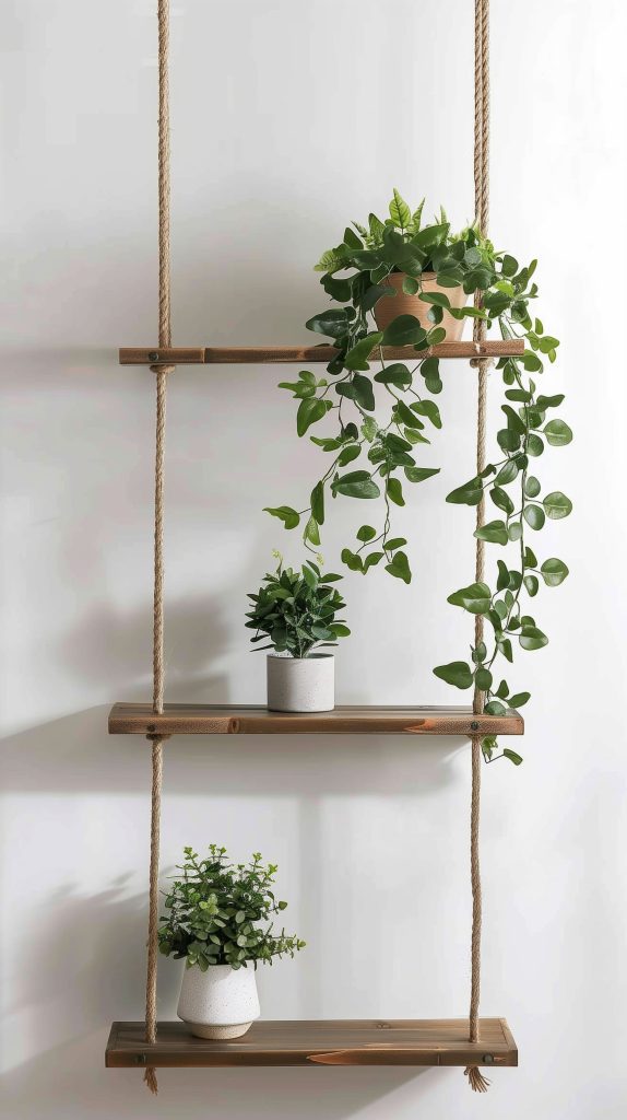 Use sturdy ropes or chains to ensure the shelves are secure Hang these shelves at varying heights for a layered look. Combine with hanging planters for a cascading green effect.