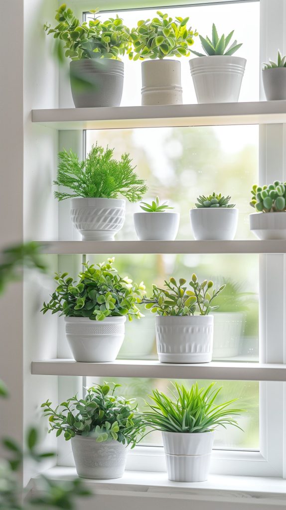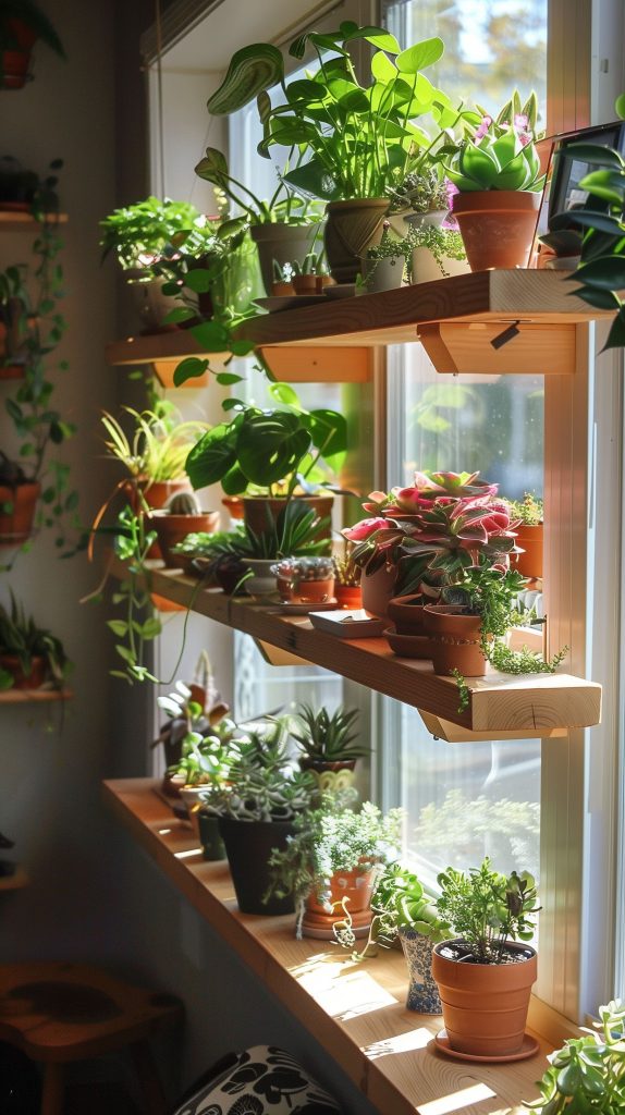 Use shelves with built-in drainage to prevent overwatering. Combine with curtains or blinds that complement your decor. Add a seating area below the window for a cozy spot to relax.