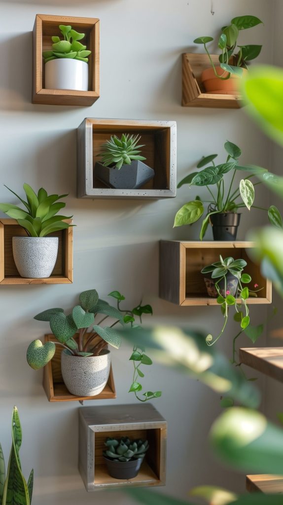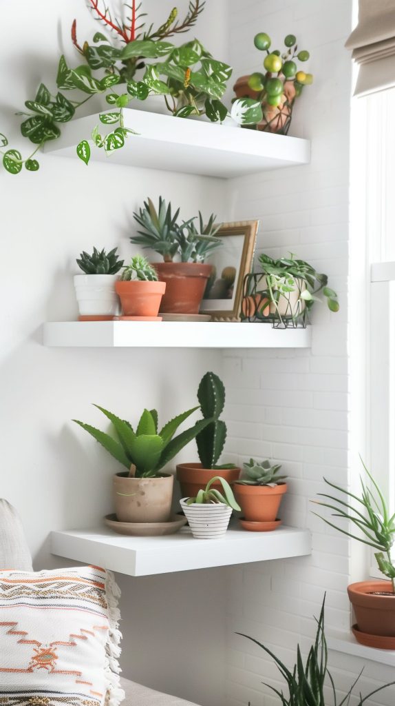 Floating corner shelves make use of unused corner space. They are perfect for small plants and decorative items.