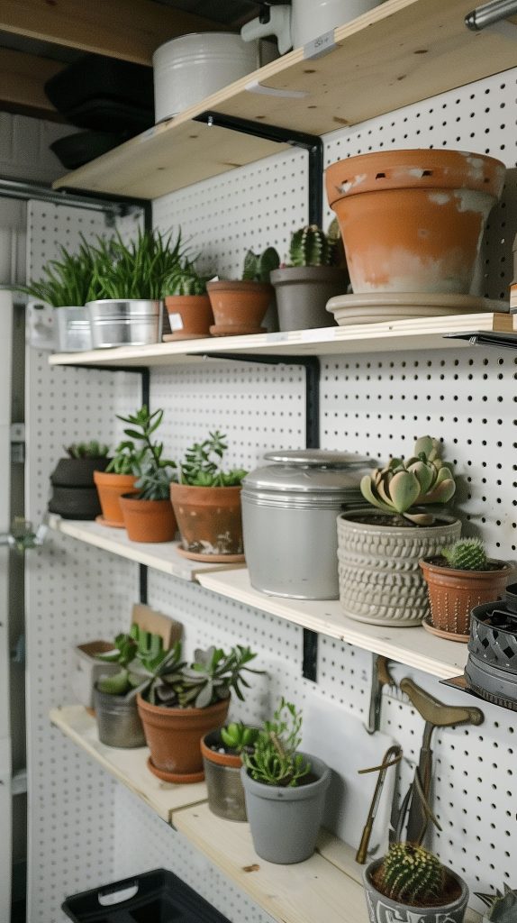 Paint the pegboard in a bold color to make it a focal point. Use wooden shelves and metal hooks for a mixed-material look. Add small planters and decorative items for variety.