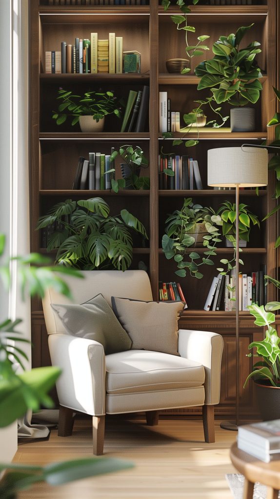 Incorporate plants into your existing bookshelf to create a green, cozy reading nook. This is an excellent way to combine functionality and aesthetics.