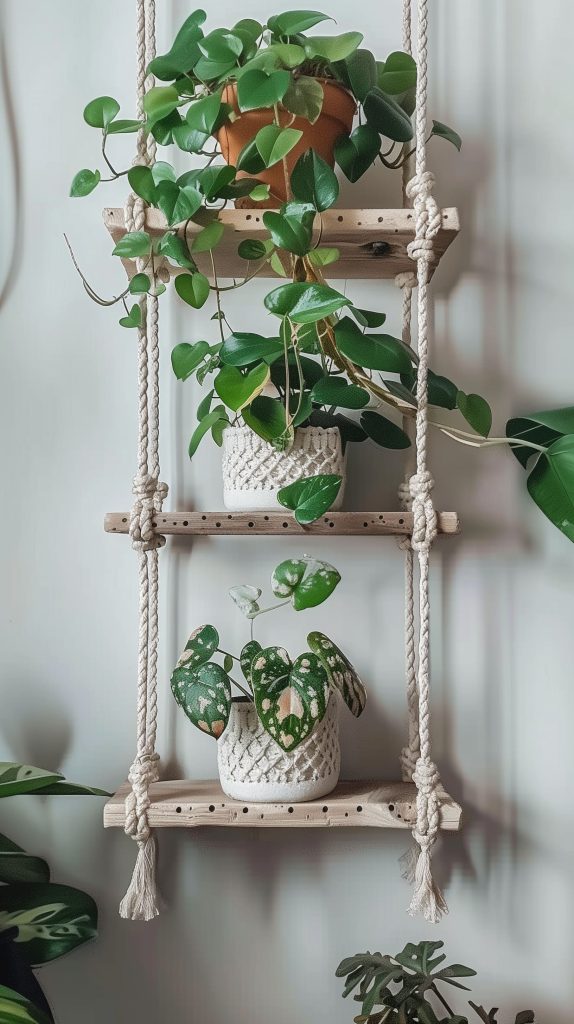 Use shelves with wooden bases and macrame hangers for stability. Hang at different heights to create a layered look. Combine with macrame plant hangers for a cohesive design.